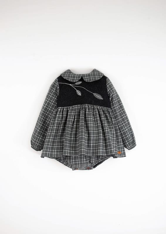 Ref. AW24.25 Mod.1.4 Dark grey plaid romper suit with skirt and baby collar