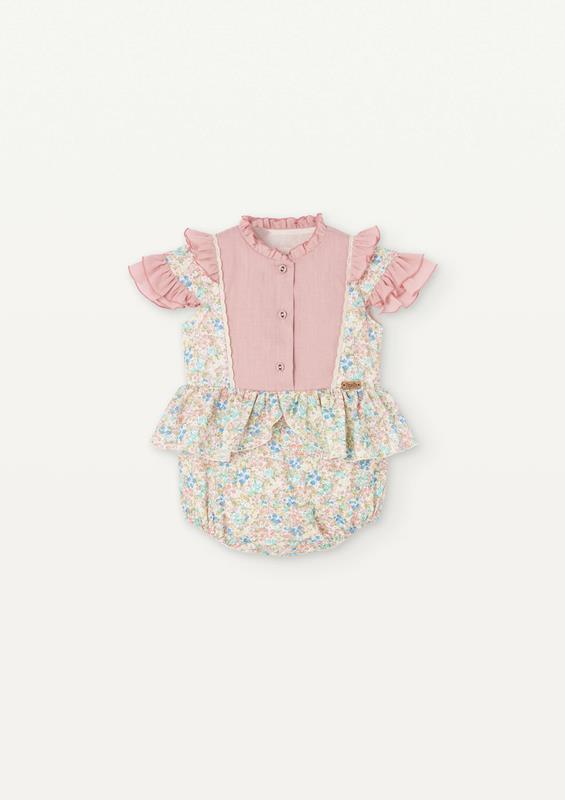 Ref. SS25 Mod 2.2 Multi-coloured floral contrasting romper suit with frills