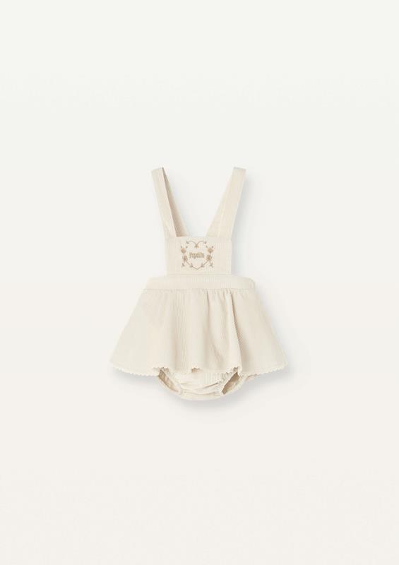 Corduroy playsuit with bib and ruffled skirt. Straps crossing over at the back. Popelin logo crafted embroidery on the bib. Straps fastened at the back with a button on the waist. Elasticated legs and waist at the back. 100% organic cotton lining.