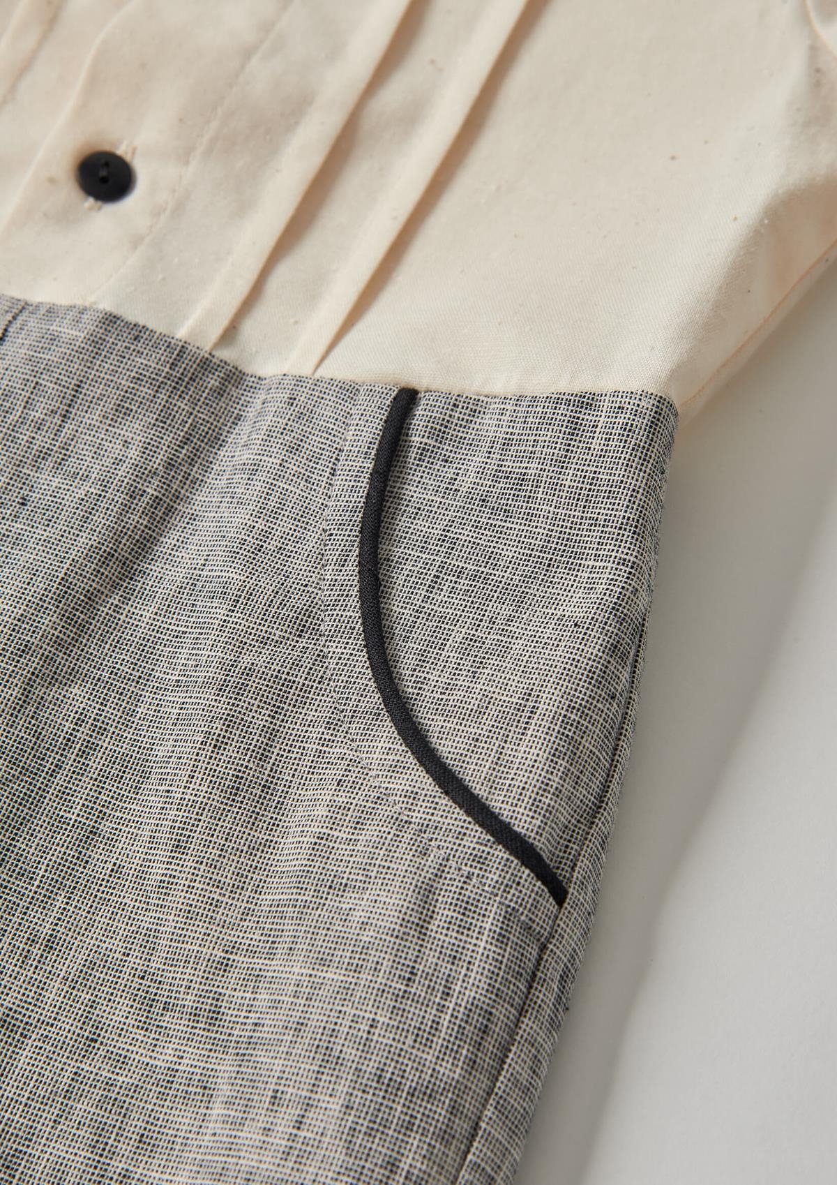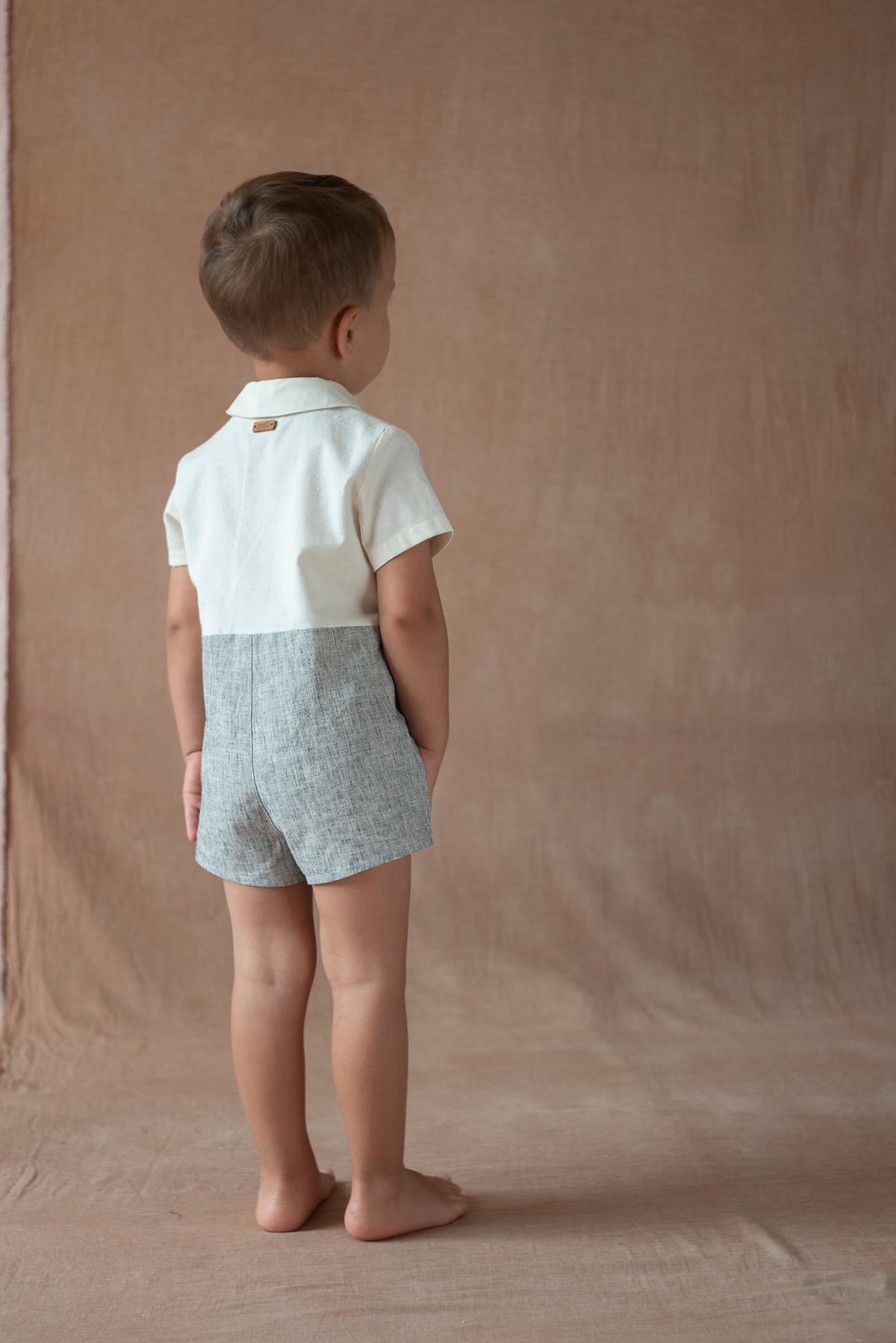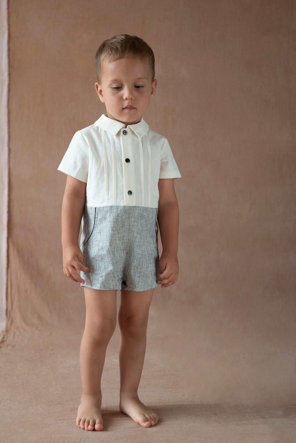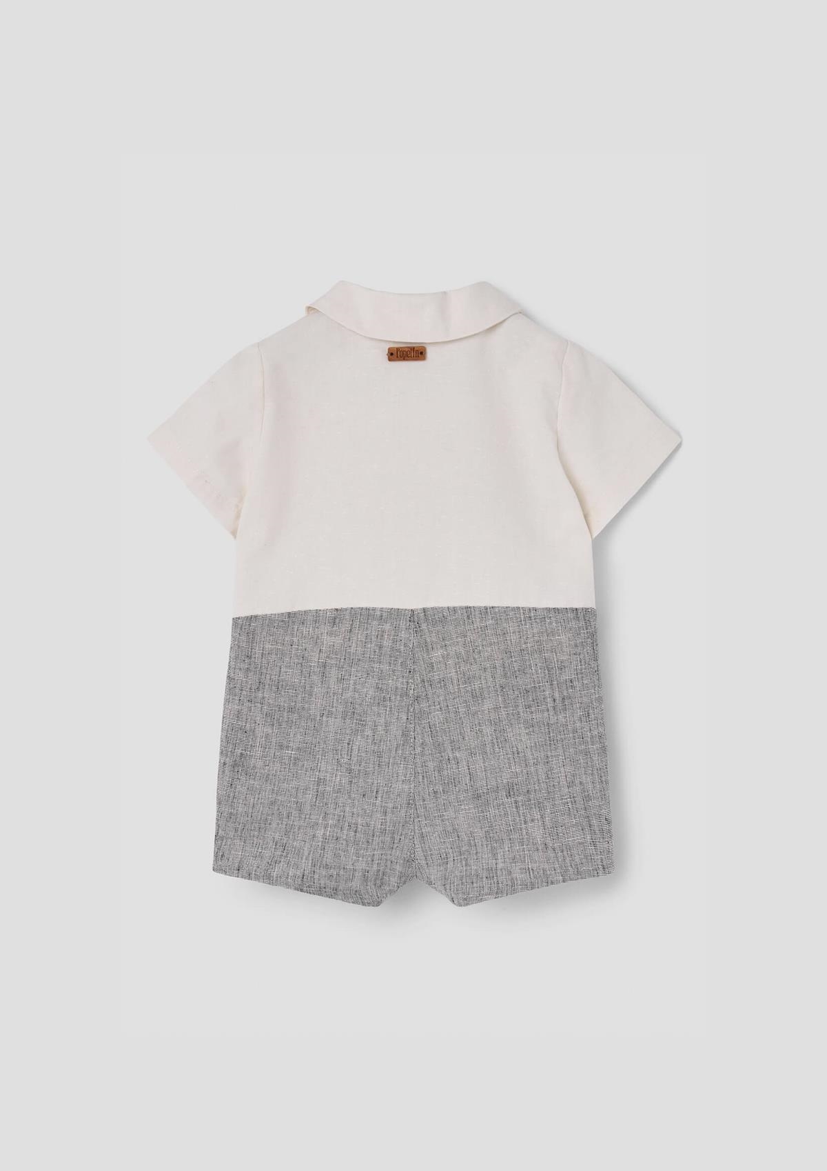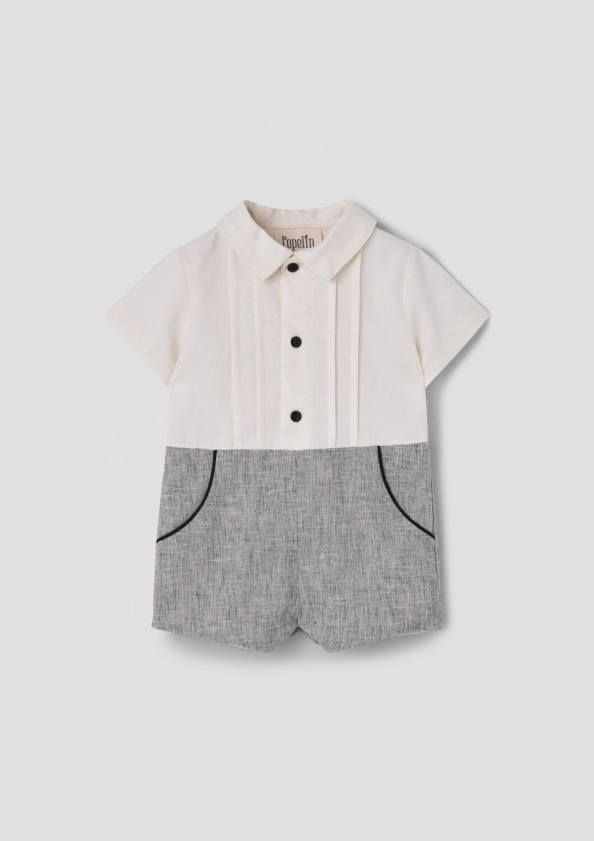 Two-tone short jumpsuit with short sleeves and top with shirt collar and pleats. Decorative pockets with drawstring detail. Wooden button opening on the front and crotch. 100% organic cotton lining.