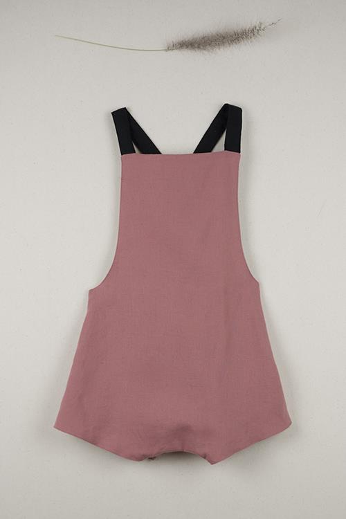 Short reversible jumpsuit with straps tied at the rear through a loophole. Elasticated waist.