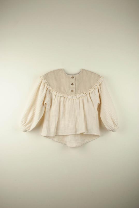 Long-sleeved blouse with frill and laced yoke. Front opening with natural wood buttons. Buttoned opening on cuff. Yoke lined with 100% organic cotton.