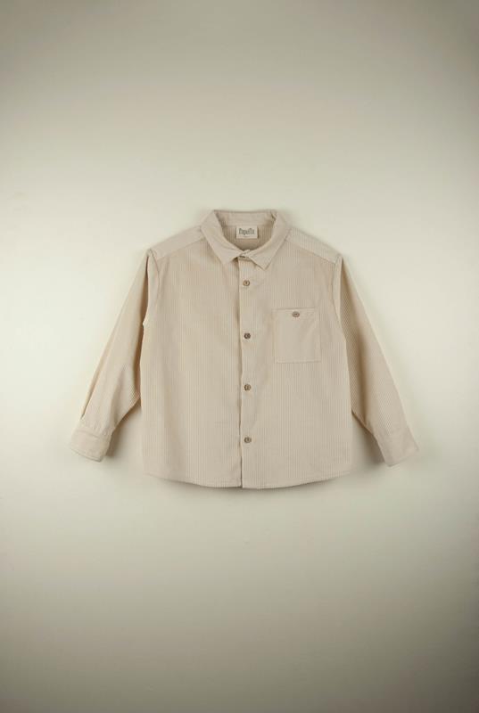 Long-sleeved shirt with lapel collar and patch pocket on the front. Front opening with natural wood buttons.