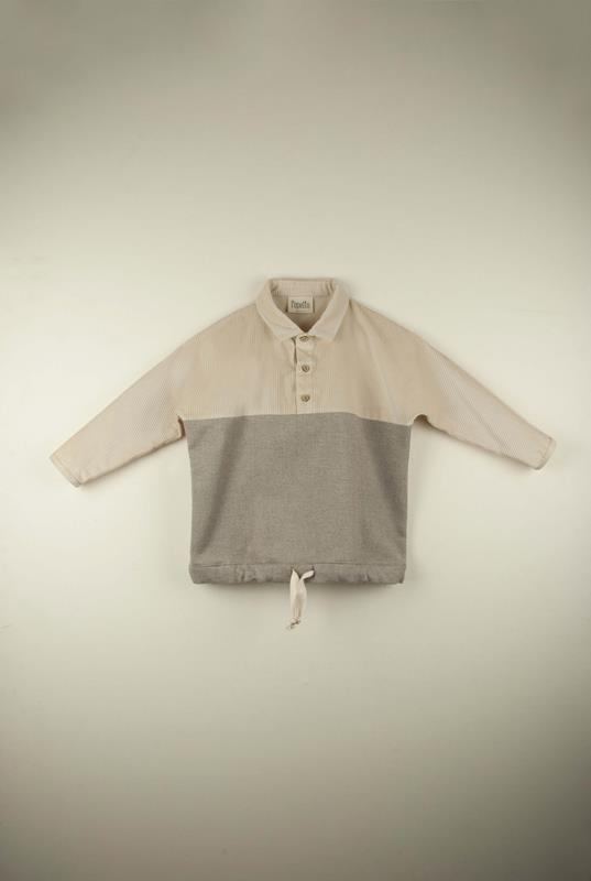 Two-tone long-sleeved shirt with lapel. Front opening with natural wood buttons. Drawstring adjustable waistband.