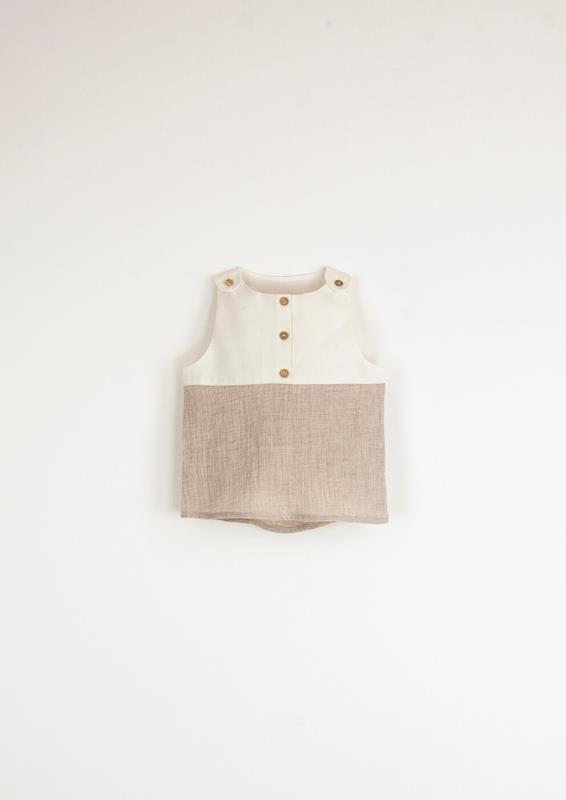 Two-tone sleeveless shirt. Wooden button opening on the shoulders.
