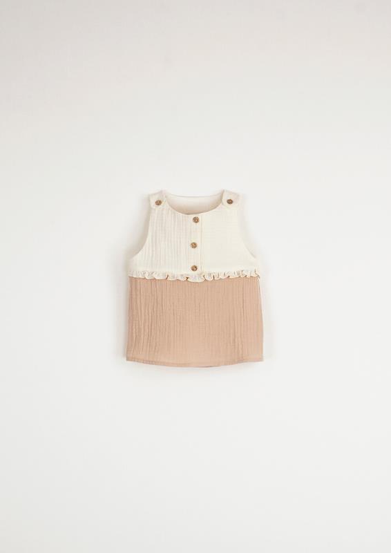 Two-tone sleeveless shirt. Wooden button opening on the shoulders.