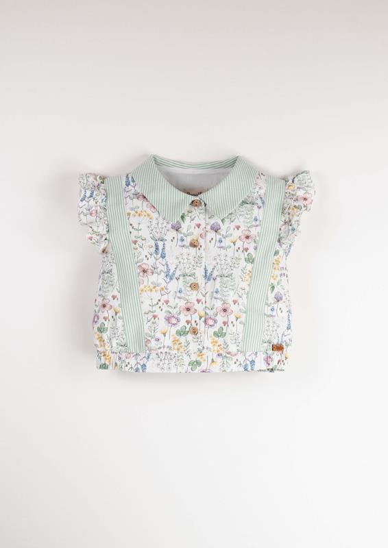 Top with shirt collar and frilled sleeves. Elasticated waist. Wood button opening on the front. 100% organic cotton lining.