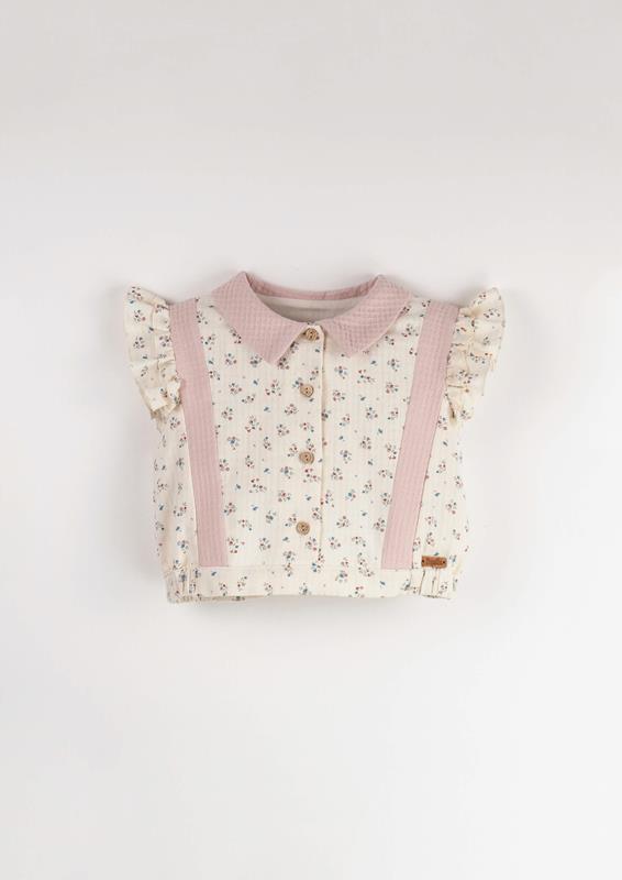 Top with shirt collar and frilled sleeves. Elasticated waist. Wood button opening on the front. 100% organic cotton lining.