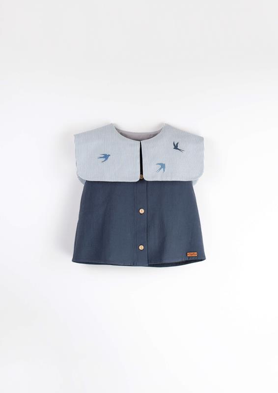 Shirt with bib collar and seagull motif artisan embroidery. Wood button opening on the front.