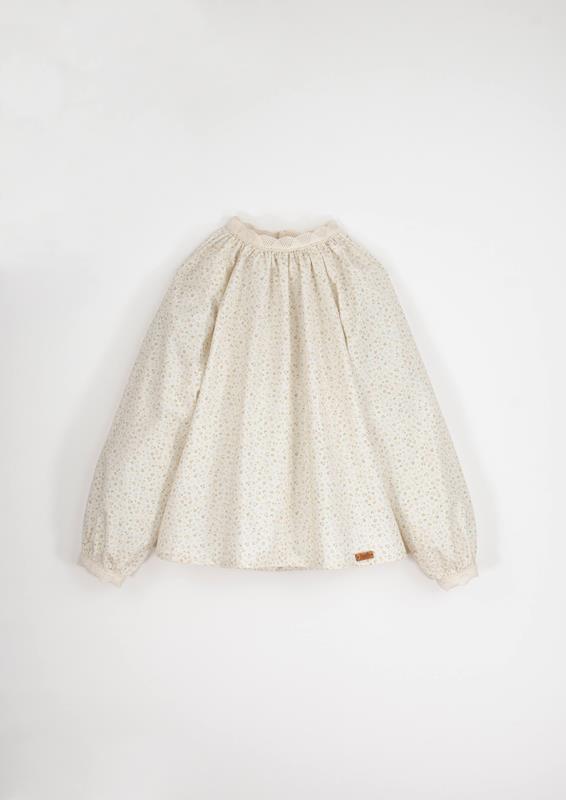 Long-sleeved blouse with raglan sleeves and lace on the neckline and cuffs. Button opening on the back and cuffs.