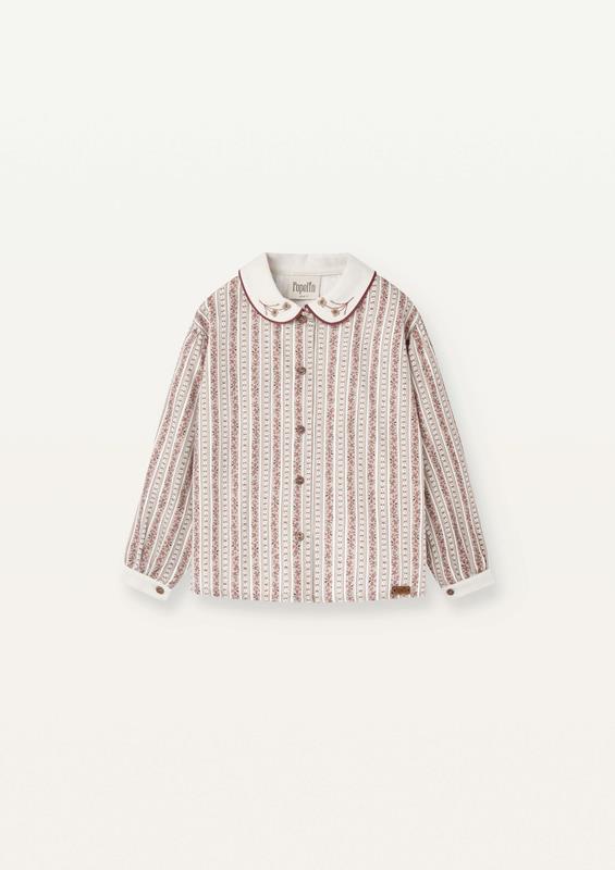 Shirt with embroidered baby collar. Long puffed sleeves and contrasting cuffs with buttons. Wooden button front opening.
