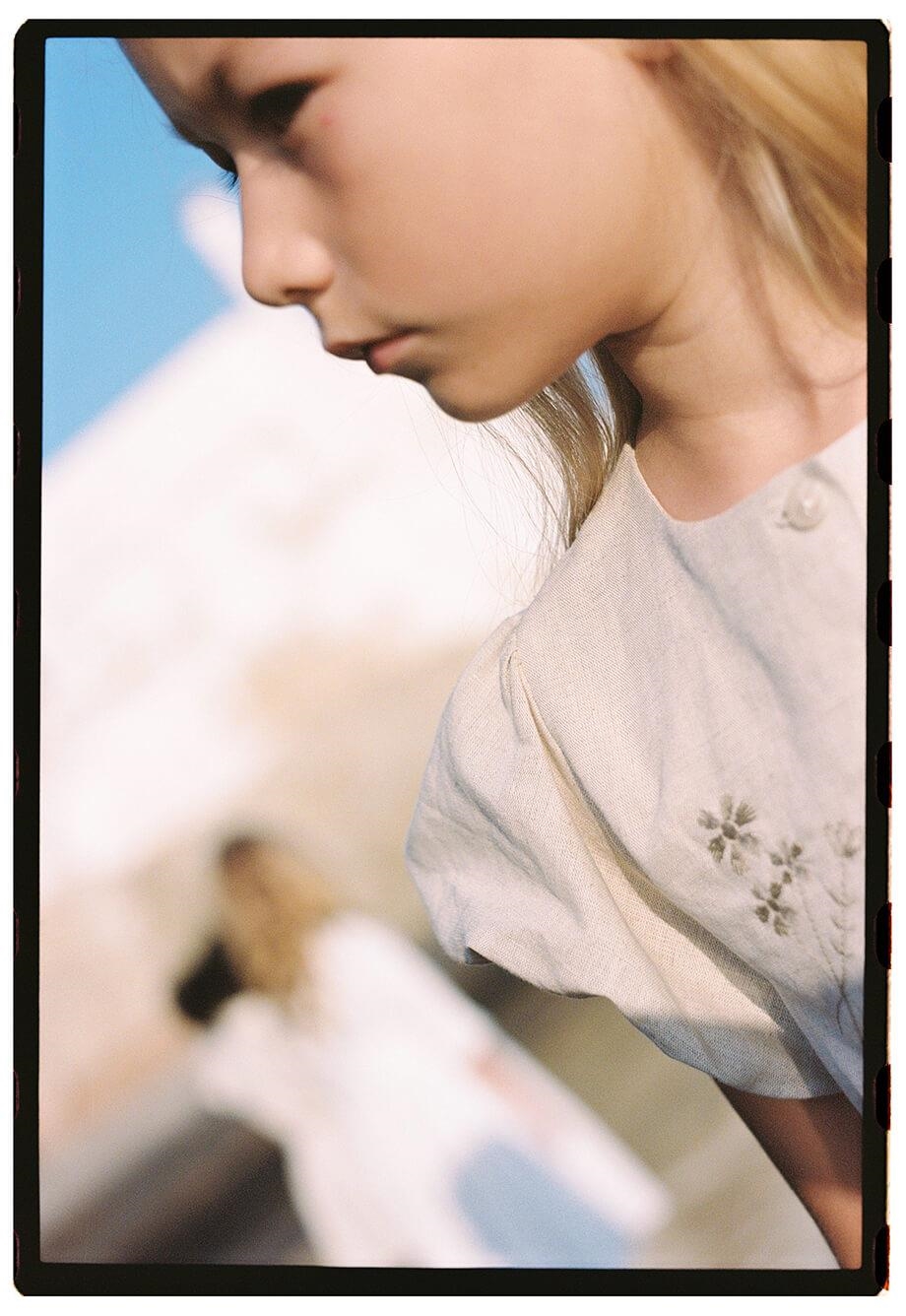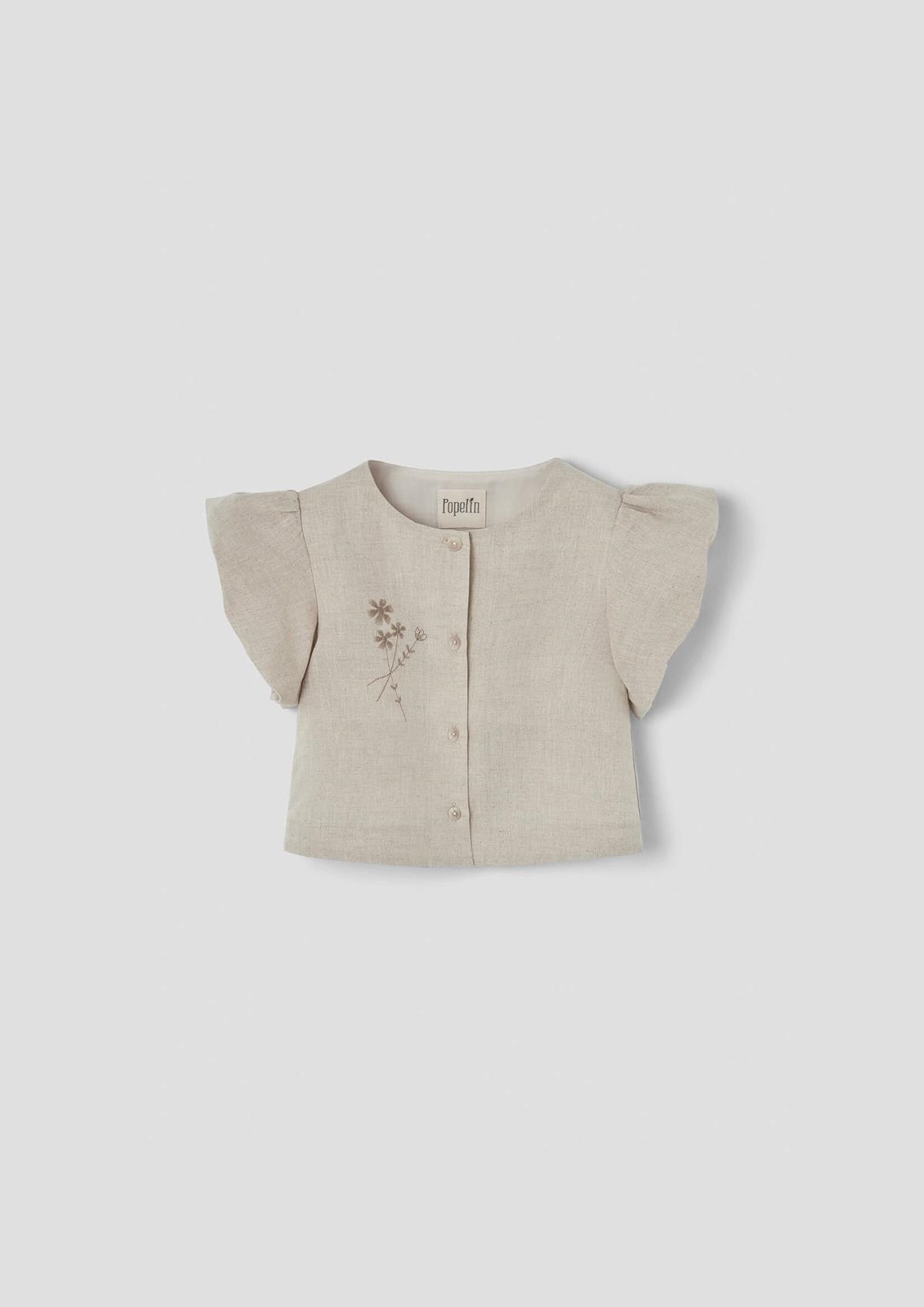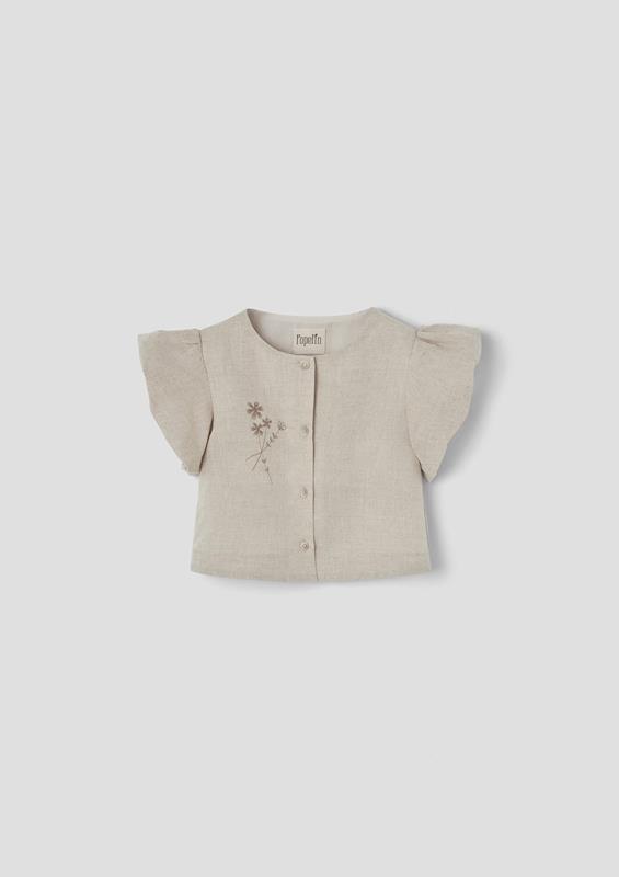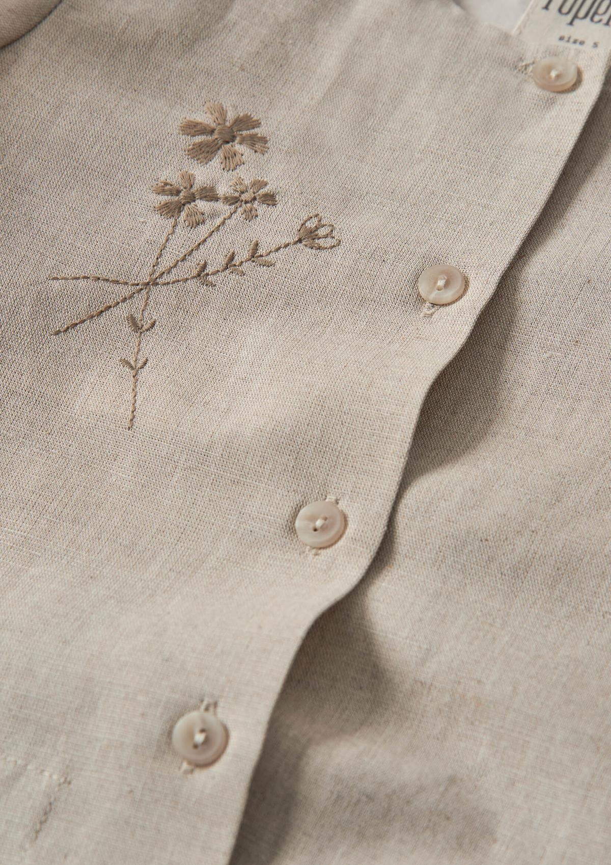 Blouse with round neckline and short puffed sleeves with floral embroidery on the front. Buttoned opening on the front. 100% organic cotton lining.