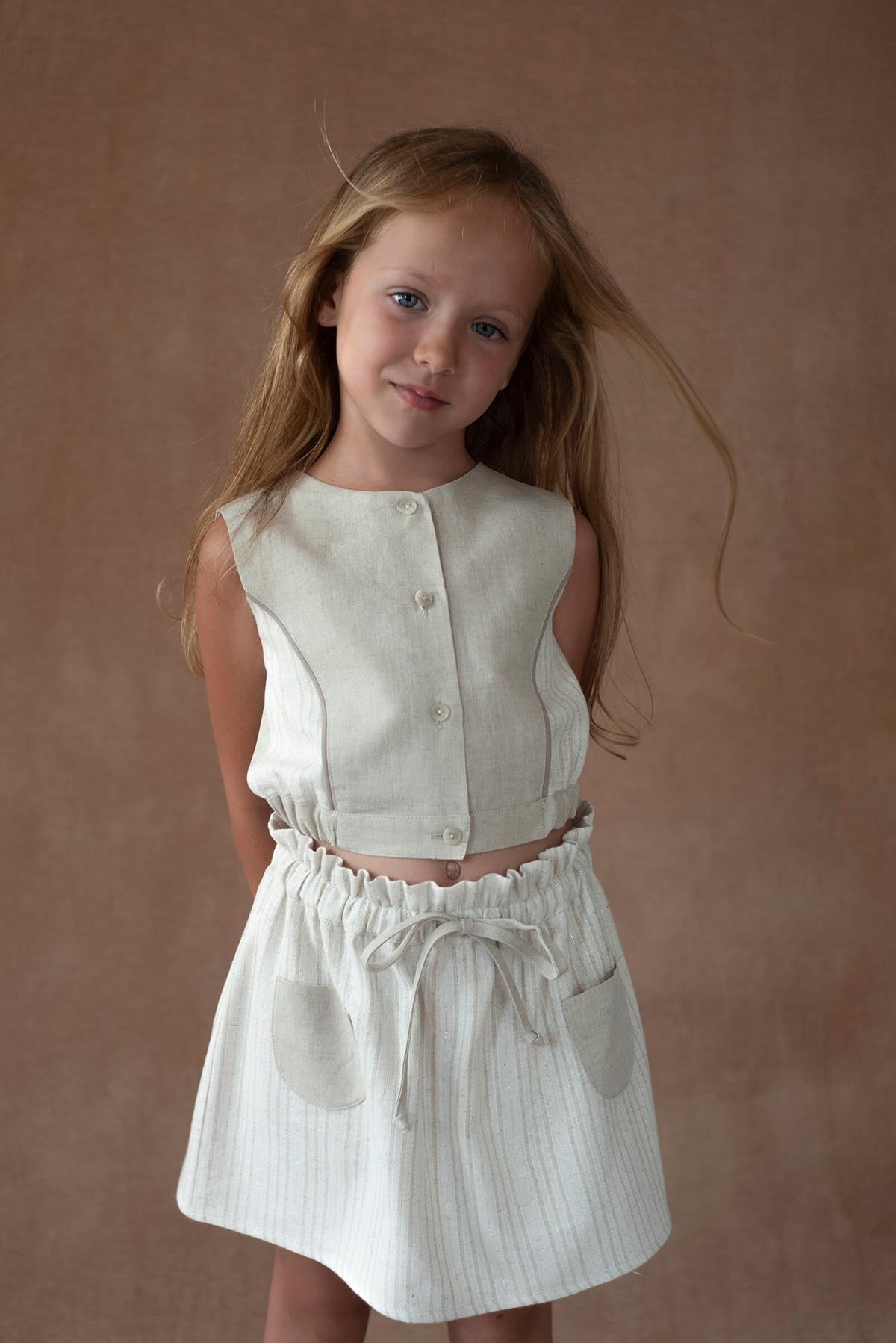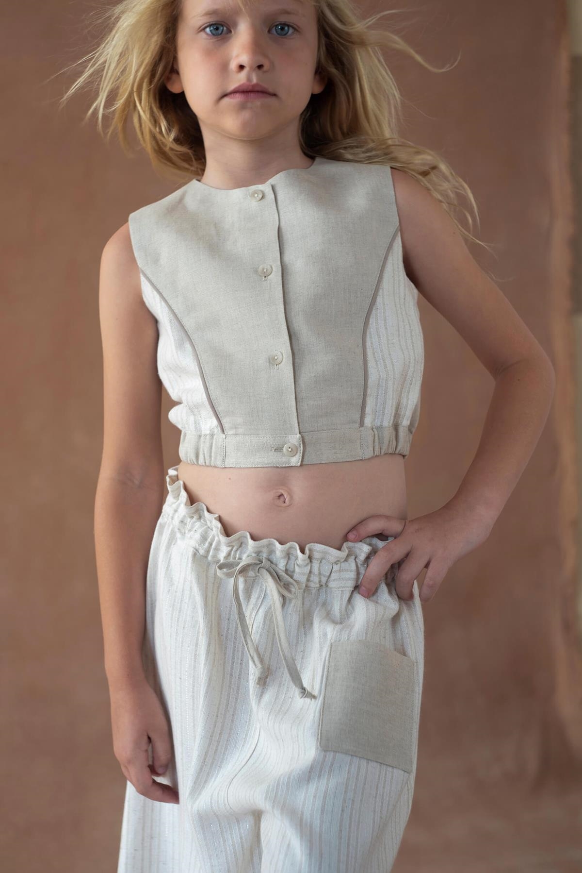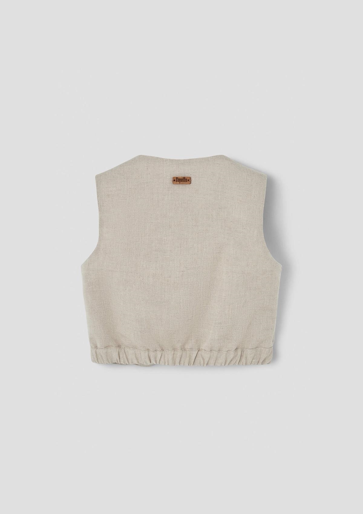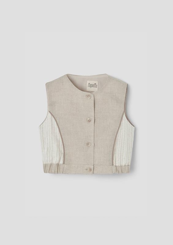 Top with cutaway sleeves, contrasting sides and decorative cord. Buttoned opening on the front. Slightly elasticated waist on the sides. 100% organic cotton lining.