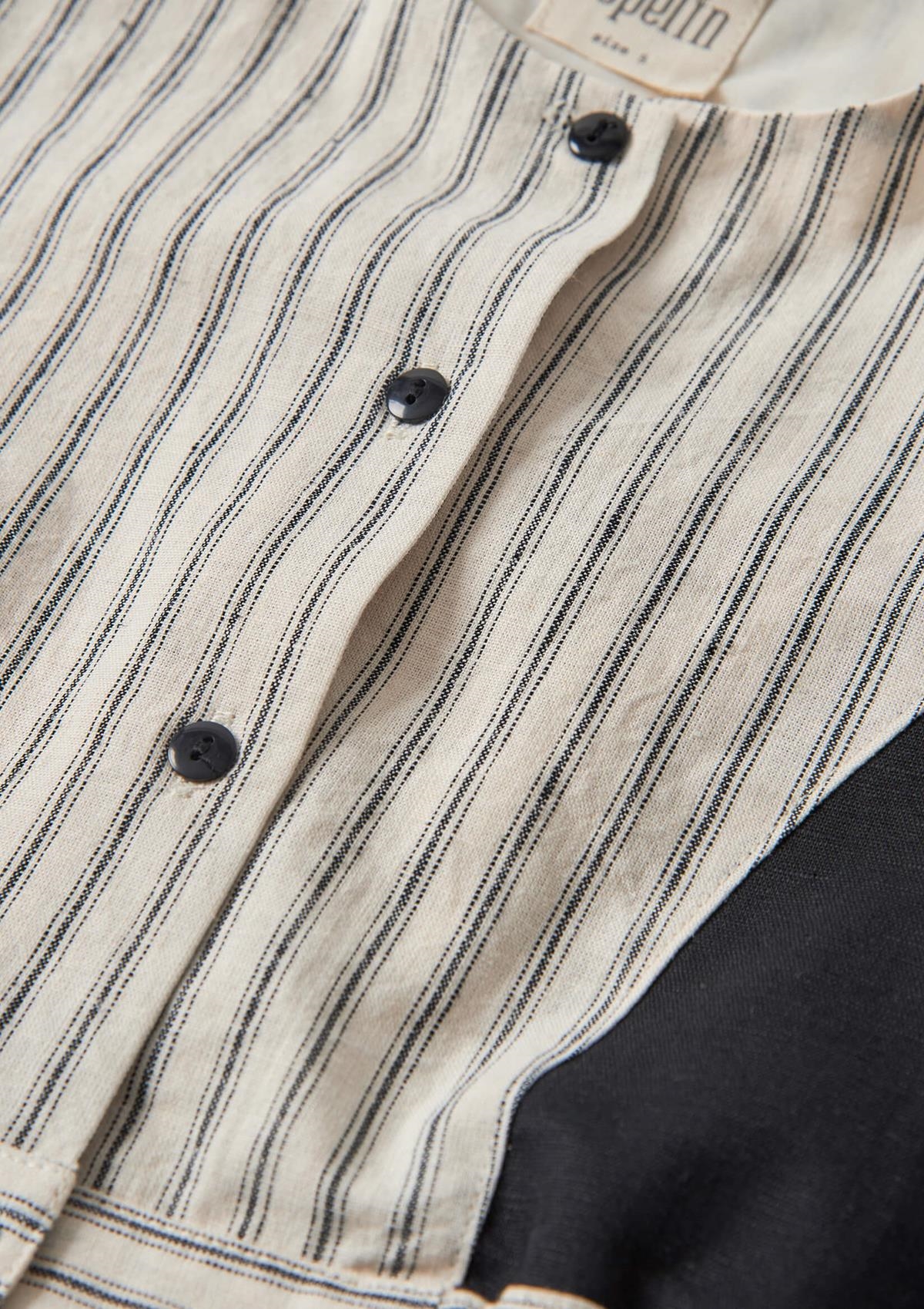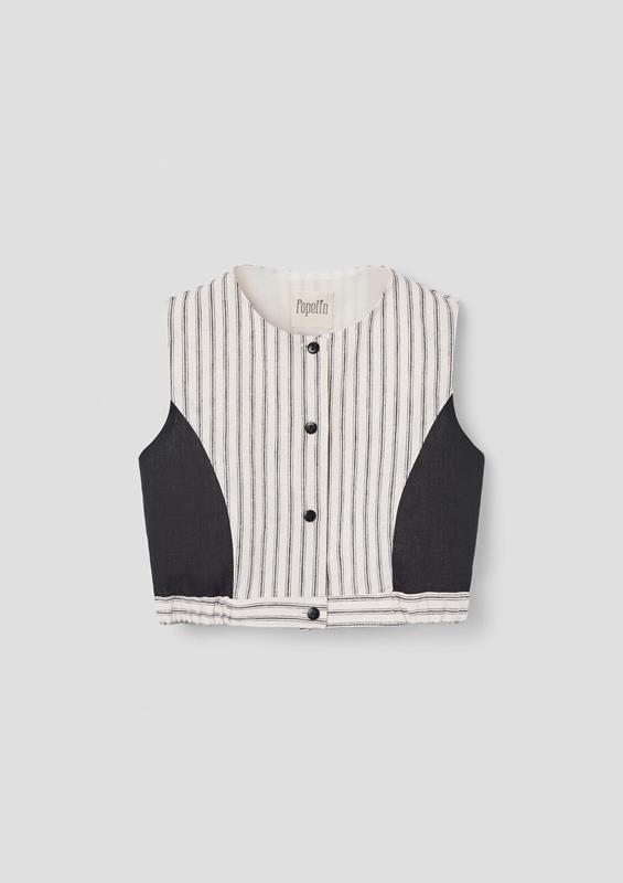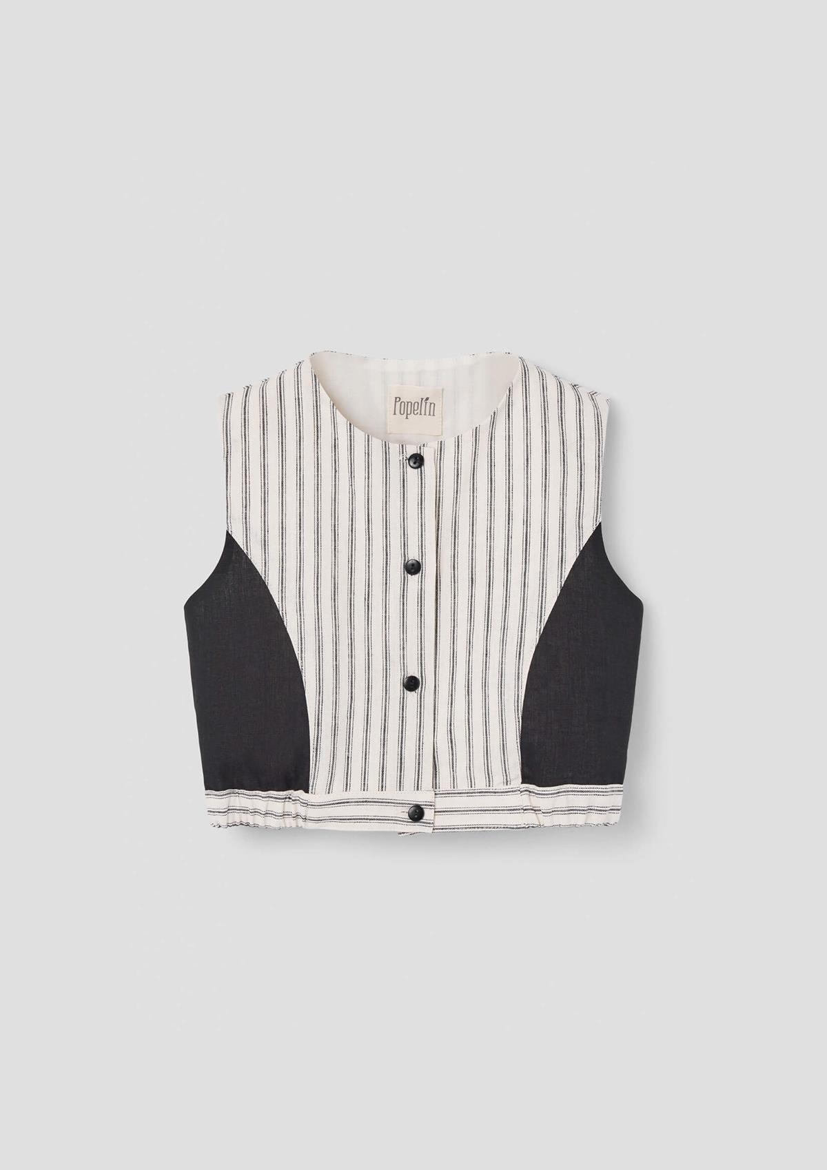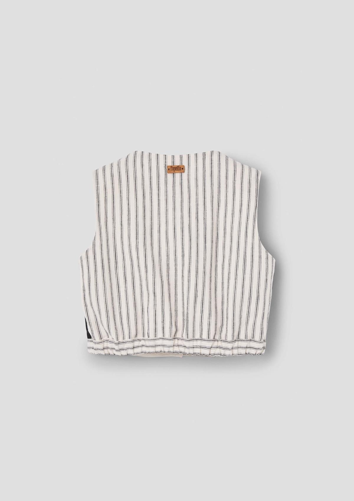 Top with cutaway sleeves, contrasting sides. Buttoned opening on the front. Slightly elasticated waist on the sides. 100% organic cotton lining.