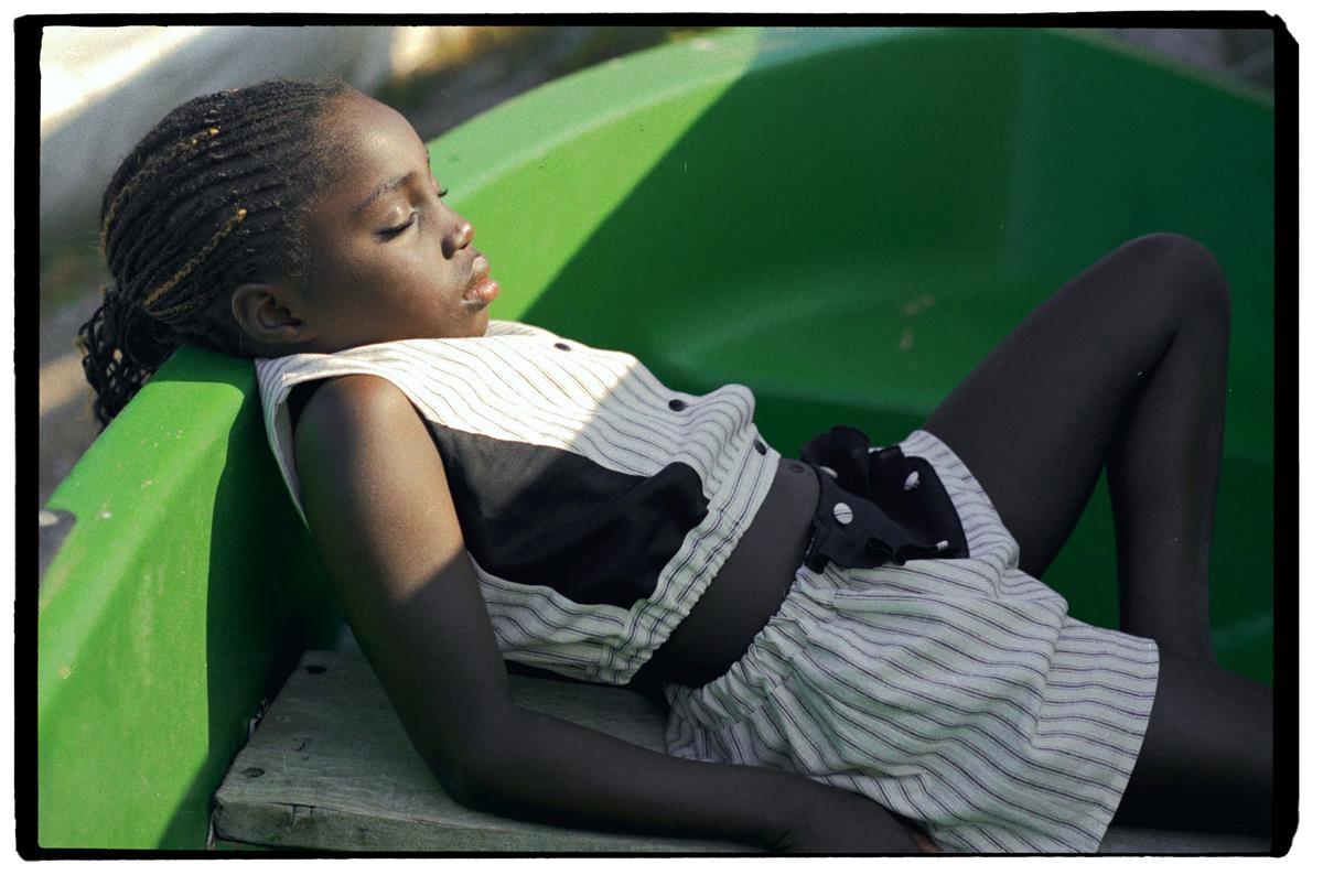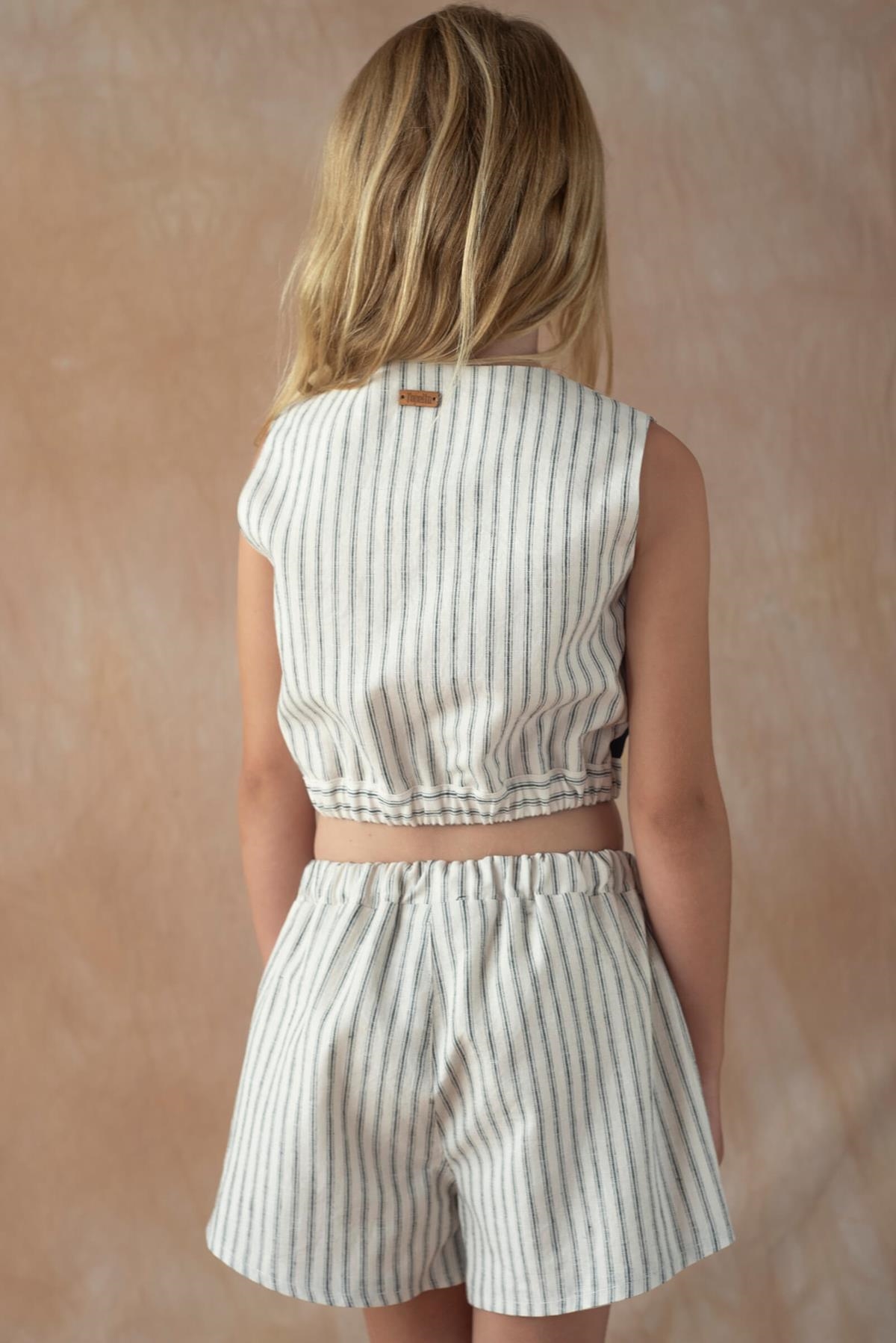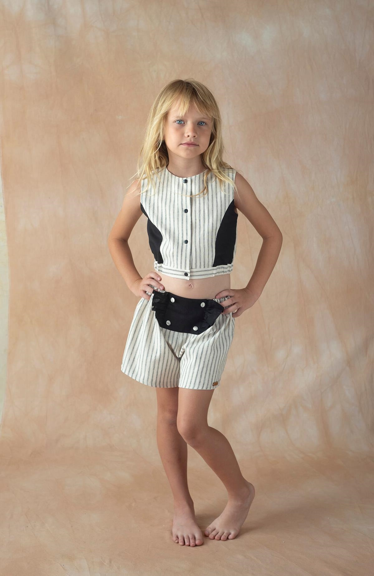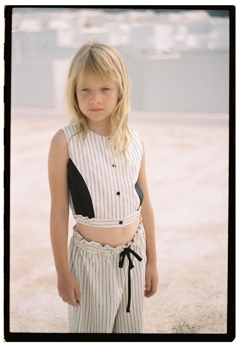 Top with cutaway sleeves, contrasting sides. Buttoned opening on the front. Slightly elasticated waist on the sides. 100% organic cotton lining.