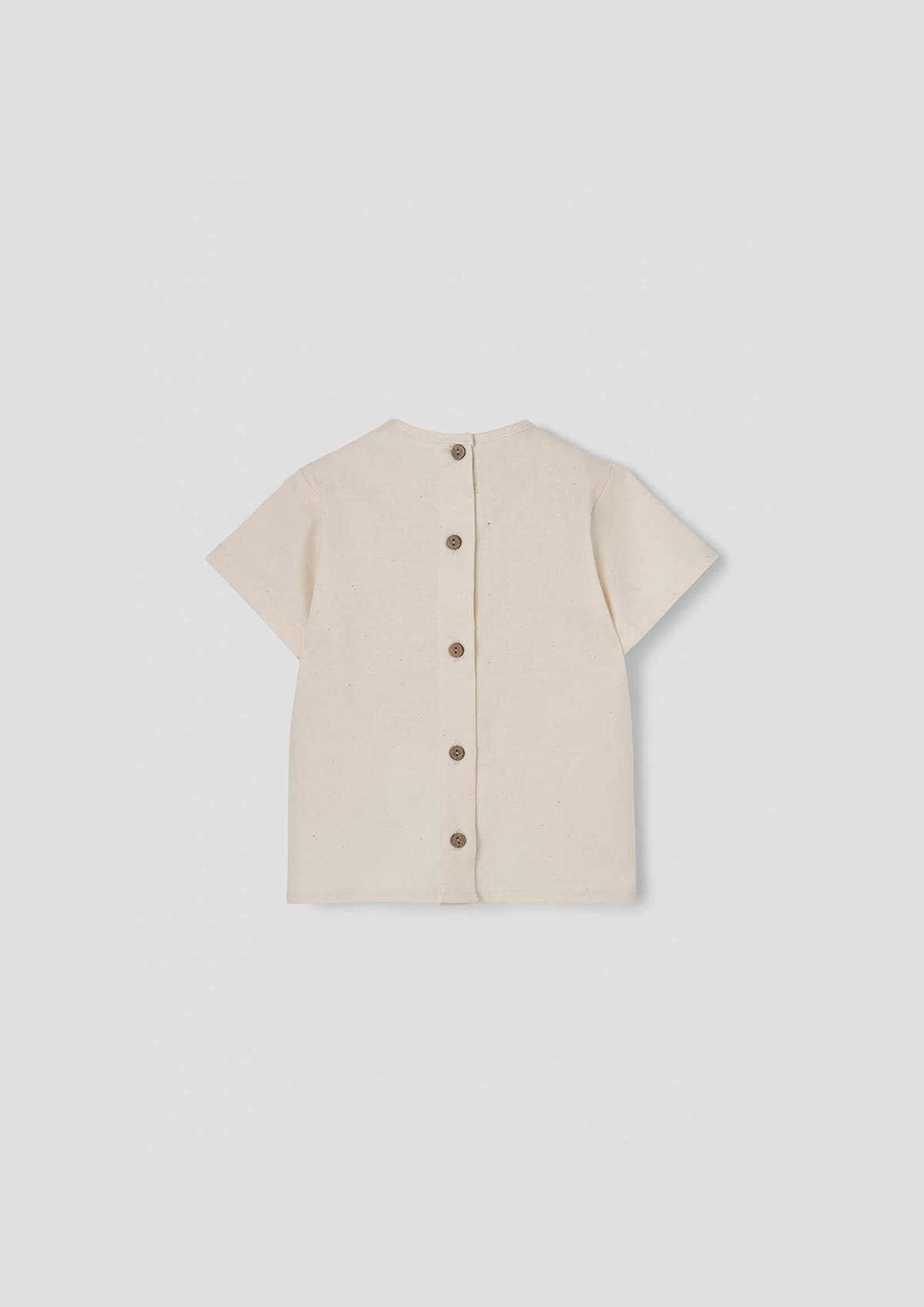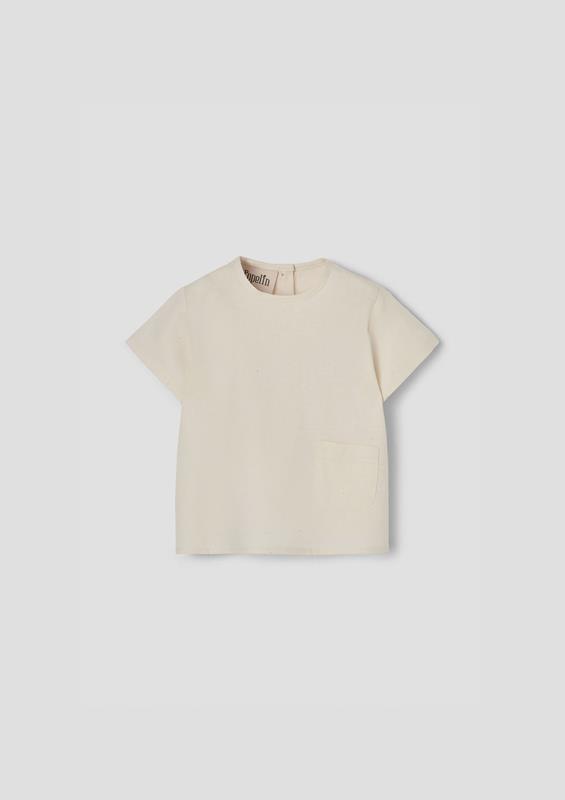 Short-sleeved shirt with round neckline and front pocket. Buttoned opening on the back