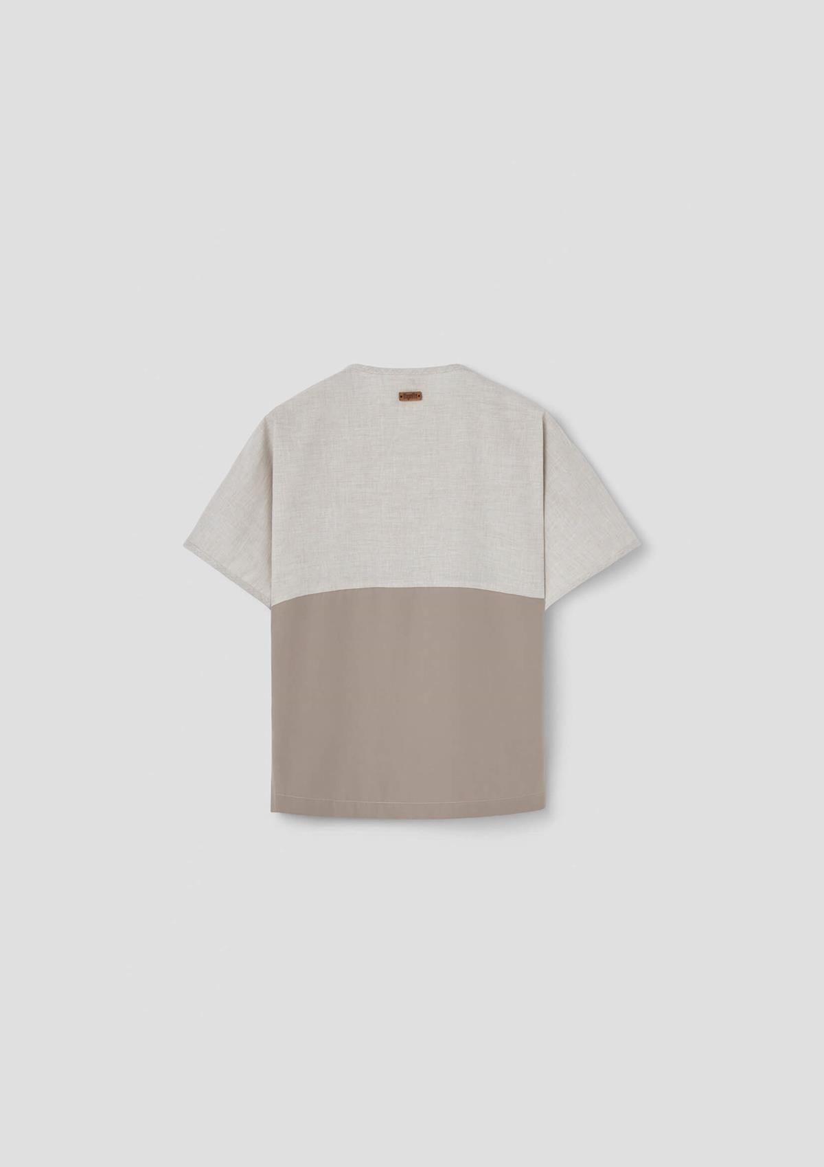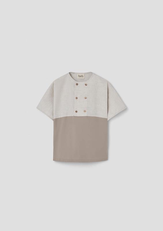 Short-sleeved shirt with contrasting bottom and double breasted buttons, round neckline and cuffs with trim.