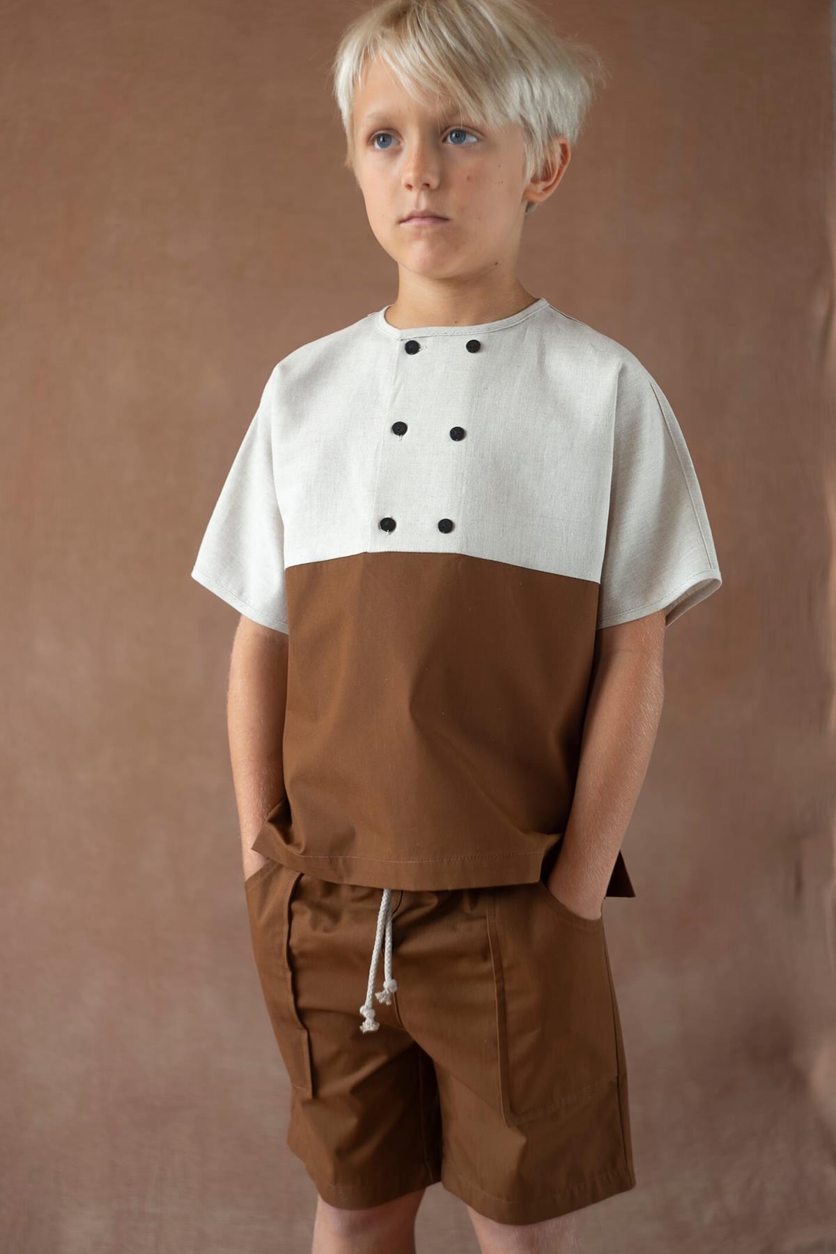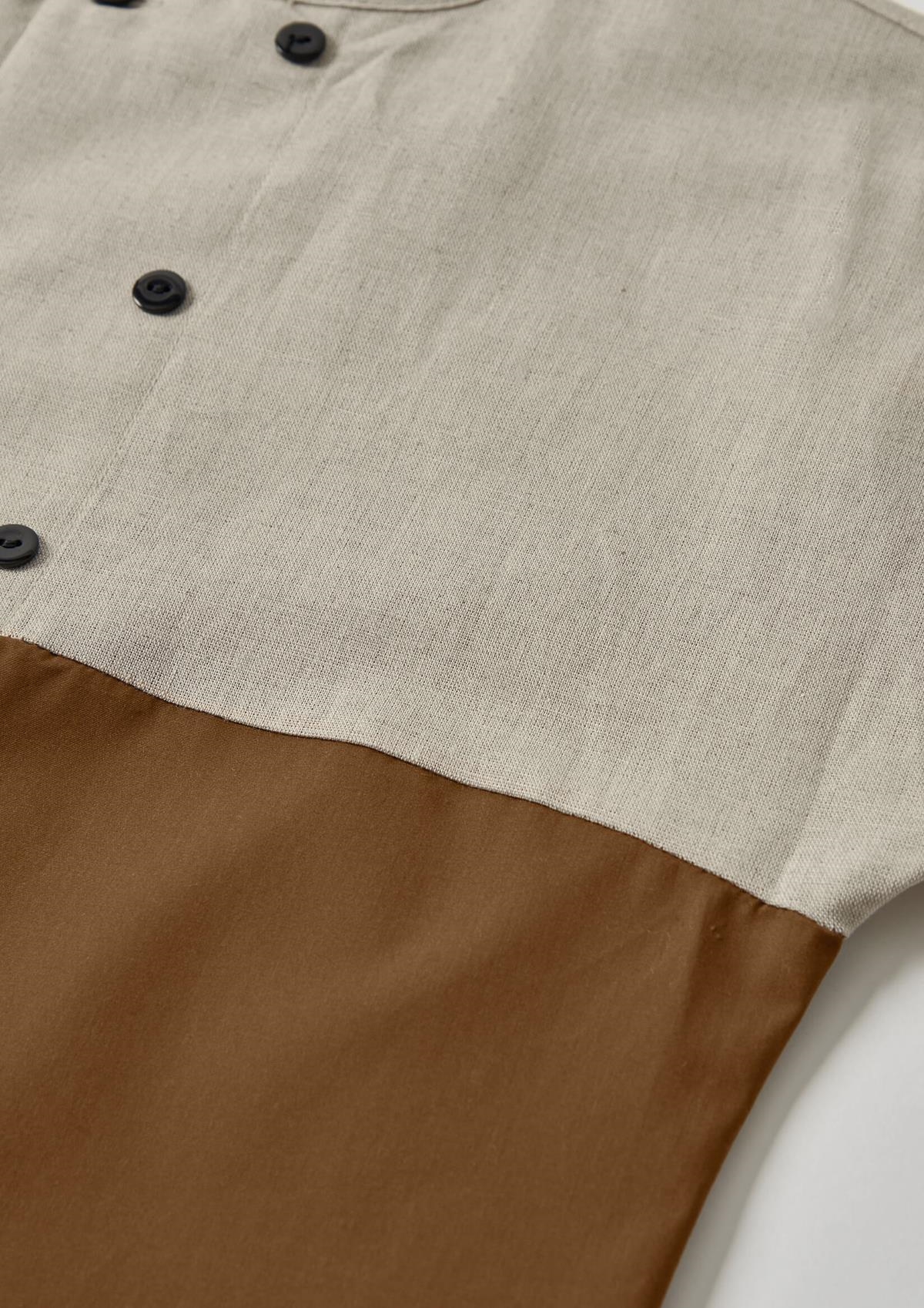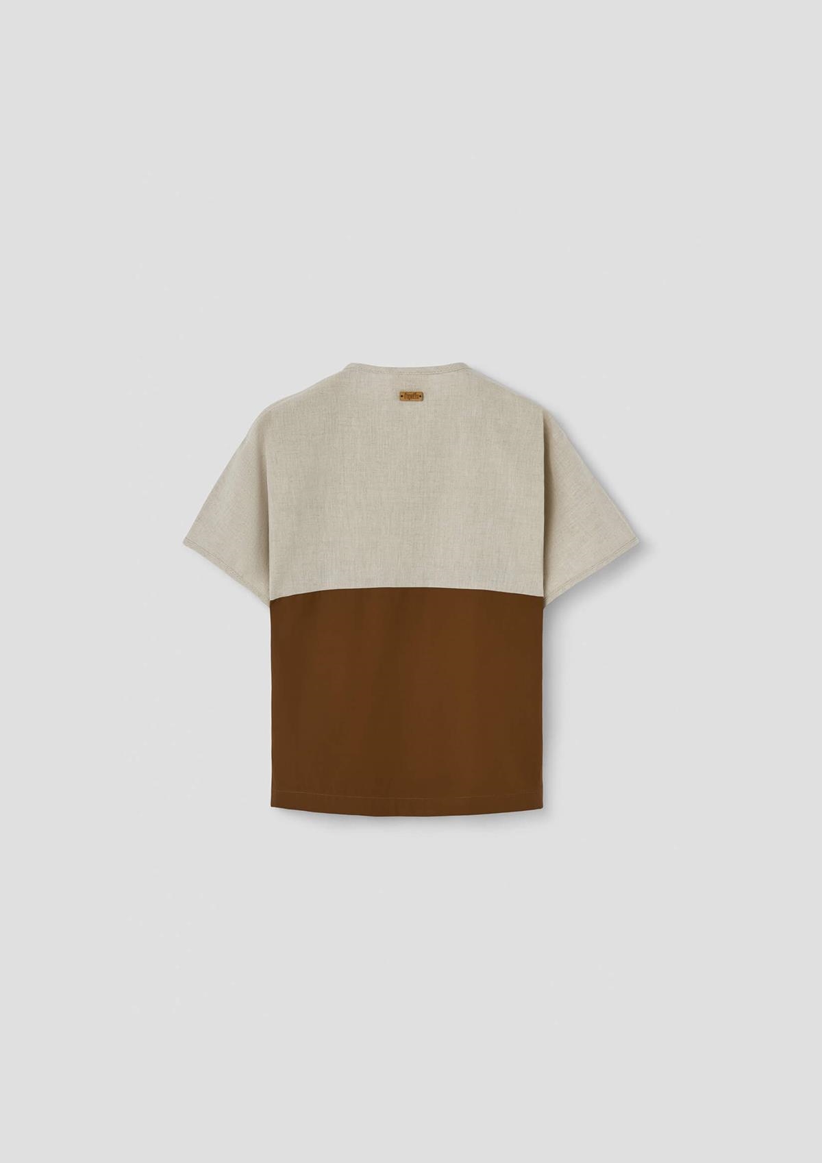 Short-sleeved shirt with contrasting bottom and double breasted buttons, round neckline and cuffs with trim.