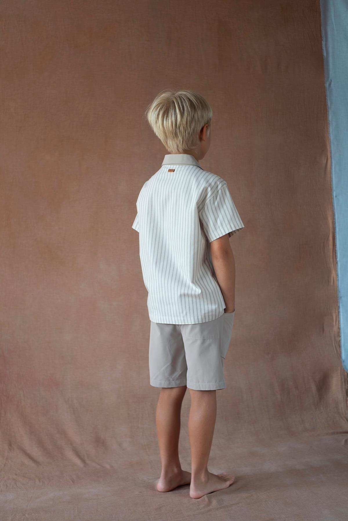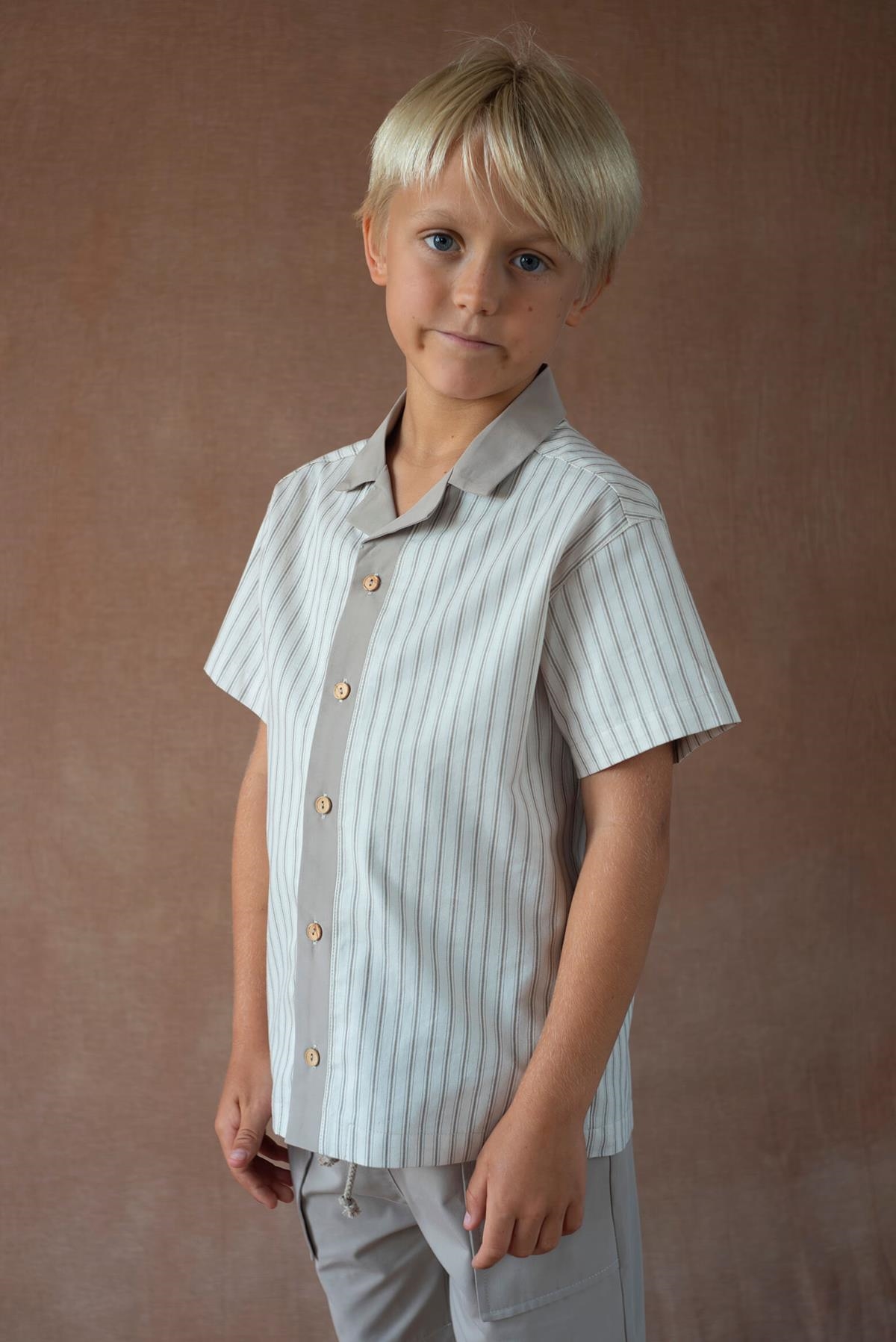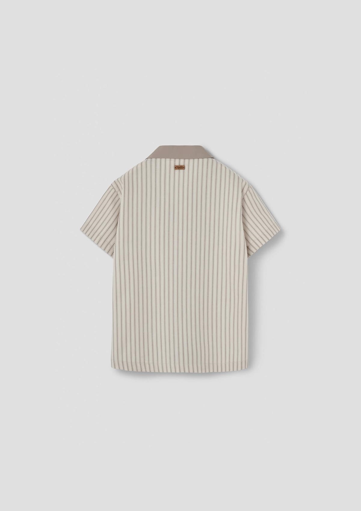 Short-sleeved shirt with contrasting lapel collar. Buttoned opening on the front.