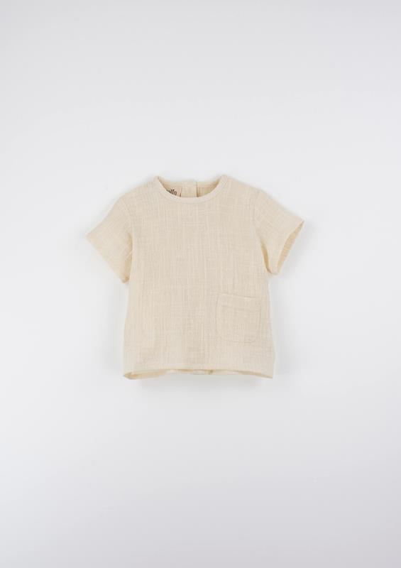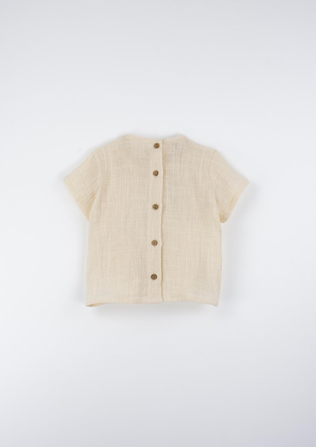 Short-sleeved shirt with round neckline and front pocket. Buttoned opening on the back