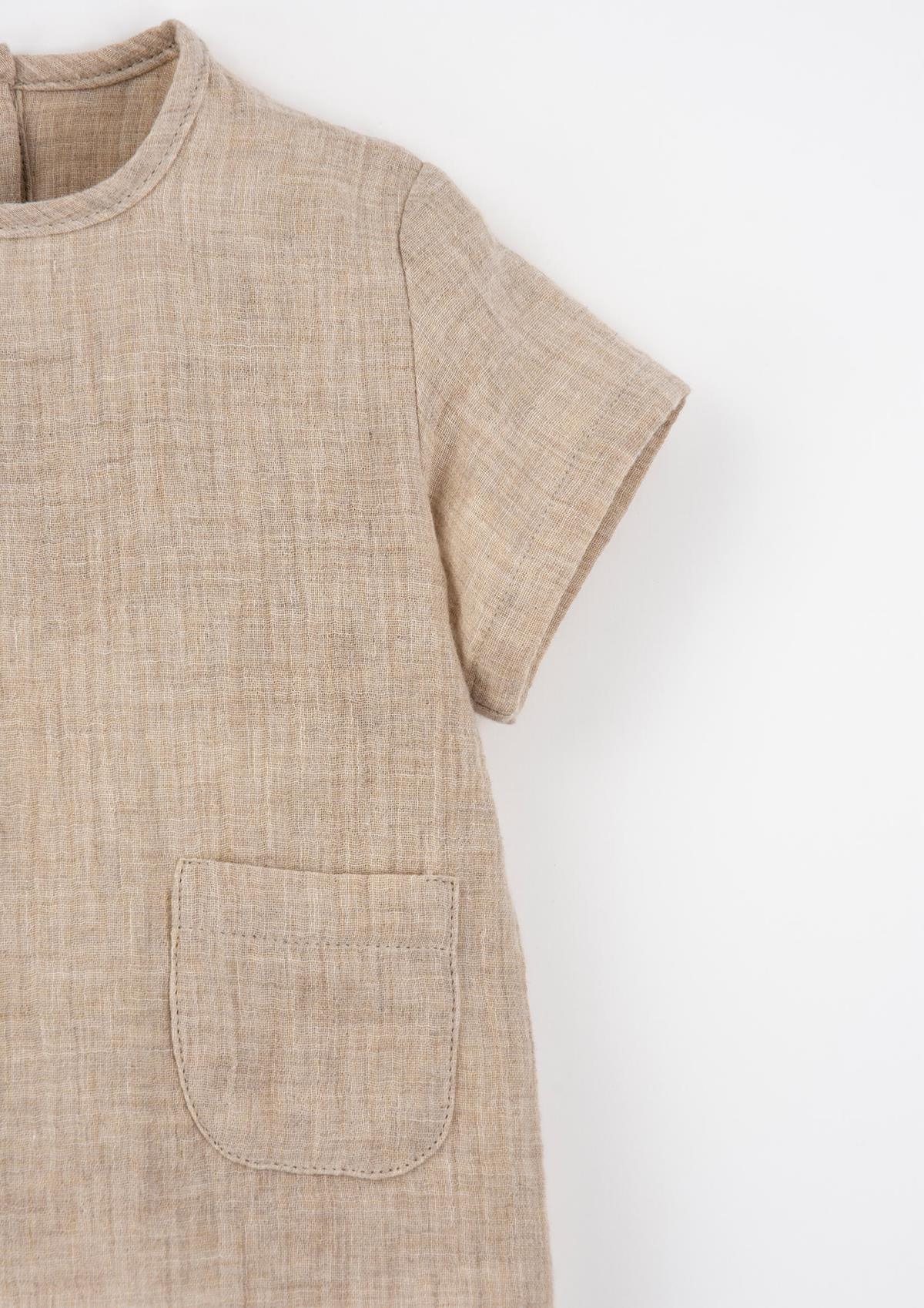 Short-sleeved shirt with round neckline and front pocket. Buttoned opening on the back