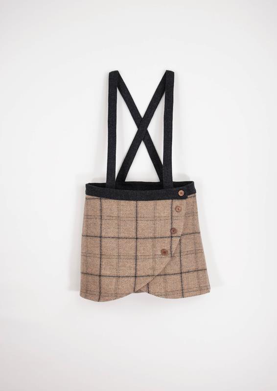 Short skirt with straps and front crossover with buttons. Adjustable elasticated waist that adapts to fit the child. Wooden button opening on the front. Exclusive top-quality wool manufactured in Spain. 100% organic cotton lining.