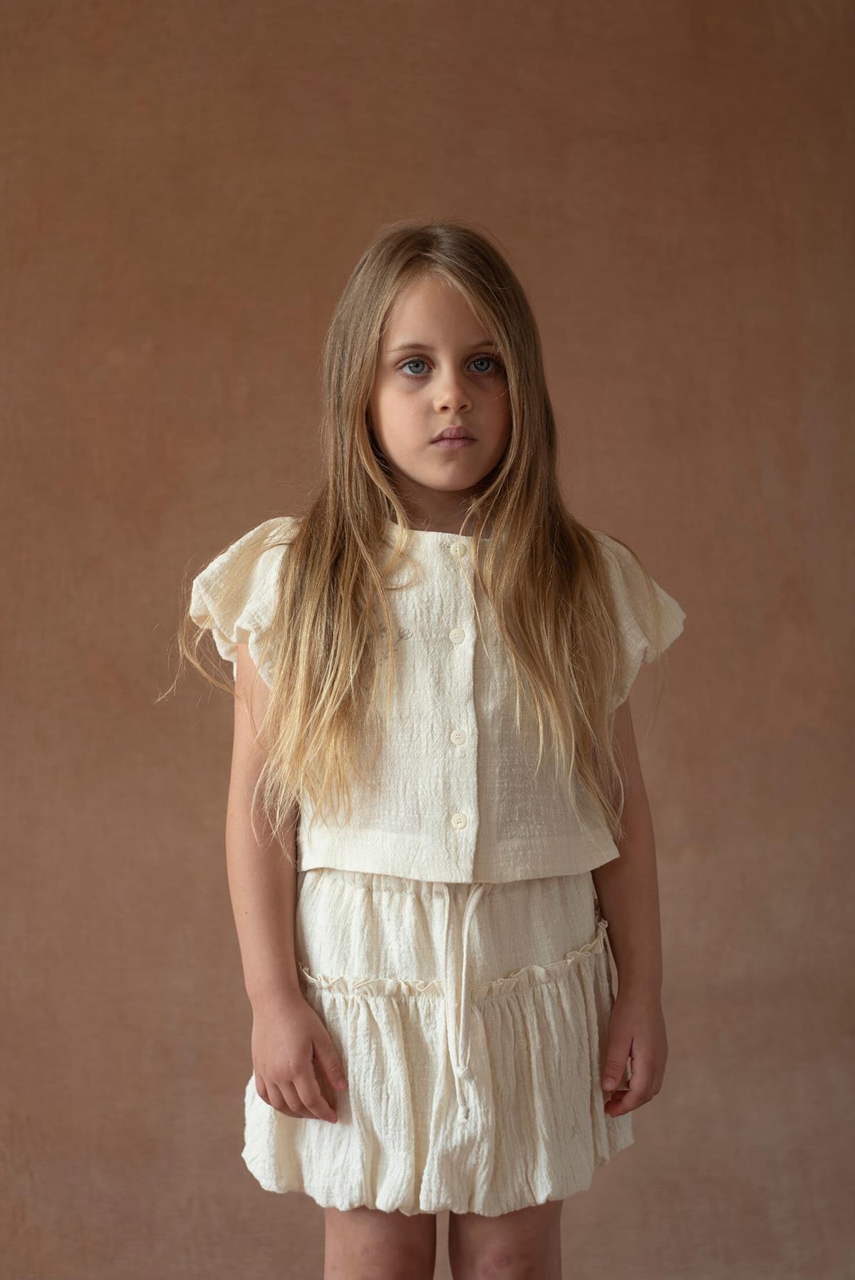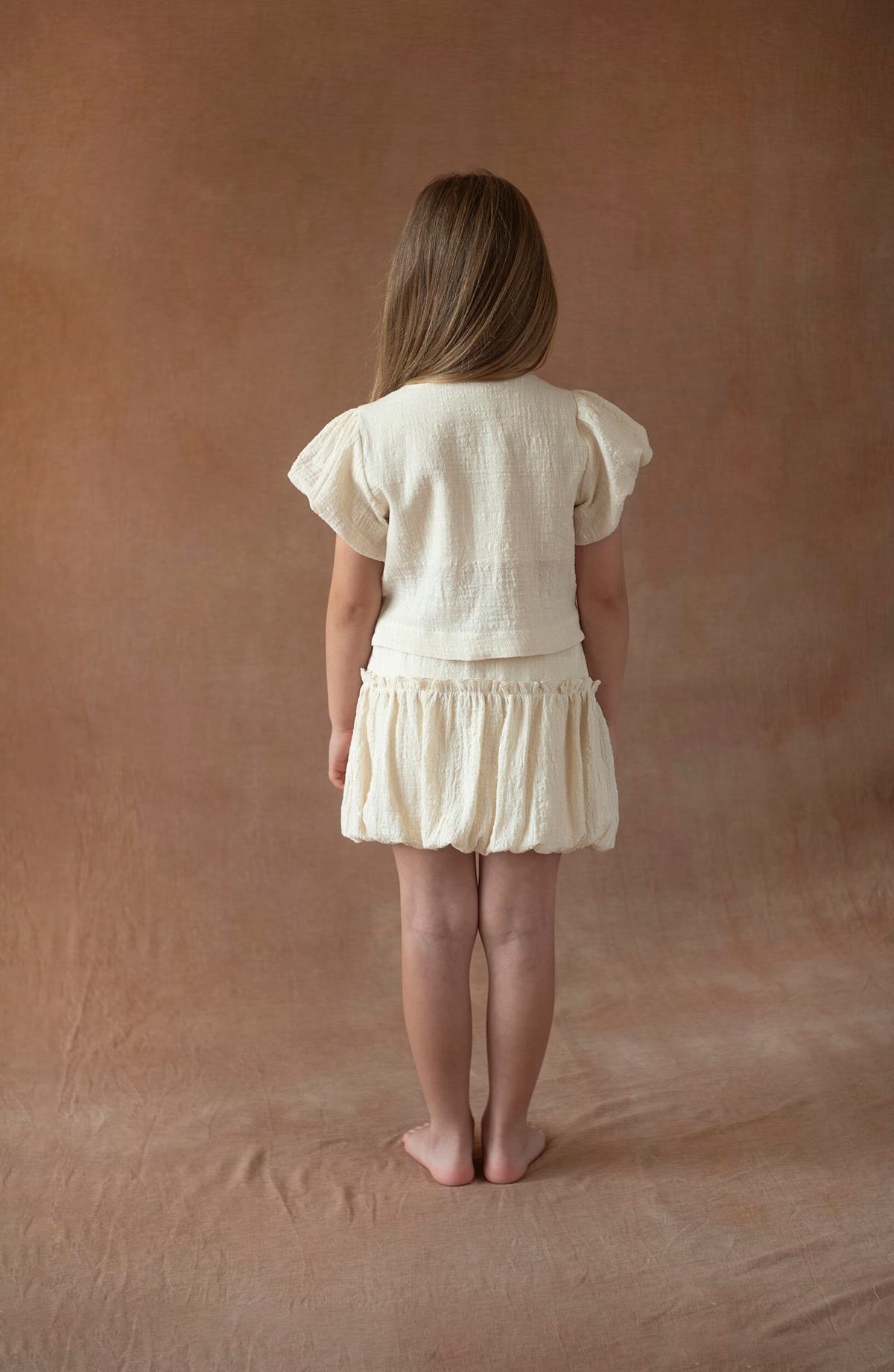 Short puffball skirt. Adjustable drawstring waist. 100% organic cotton lining.