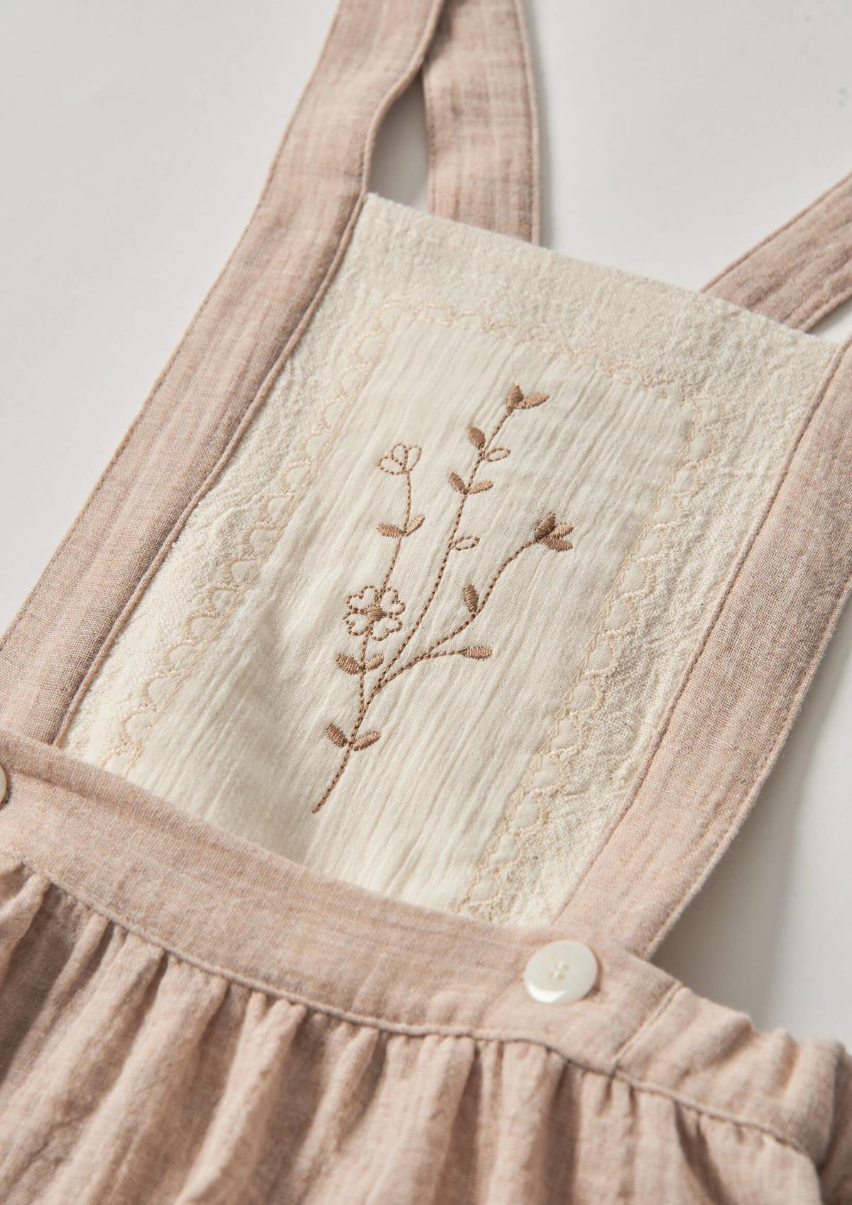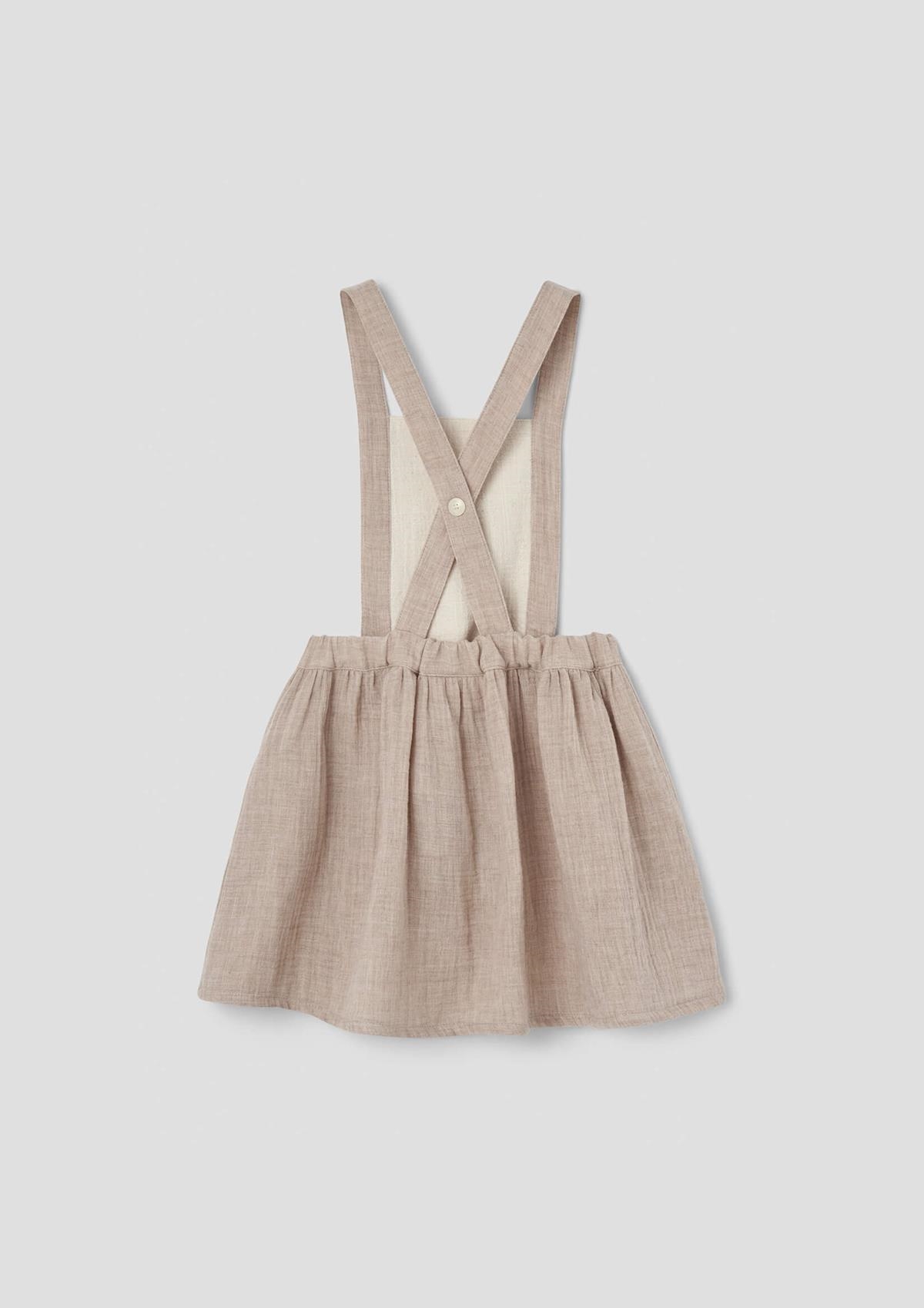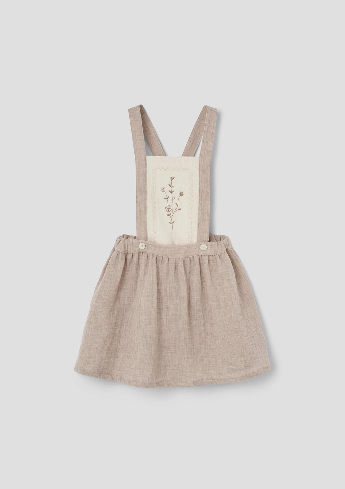 Short skirt with straps and embroidered bib. Elasticated waist and straps crossing over at the back with button on the front.