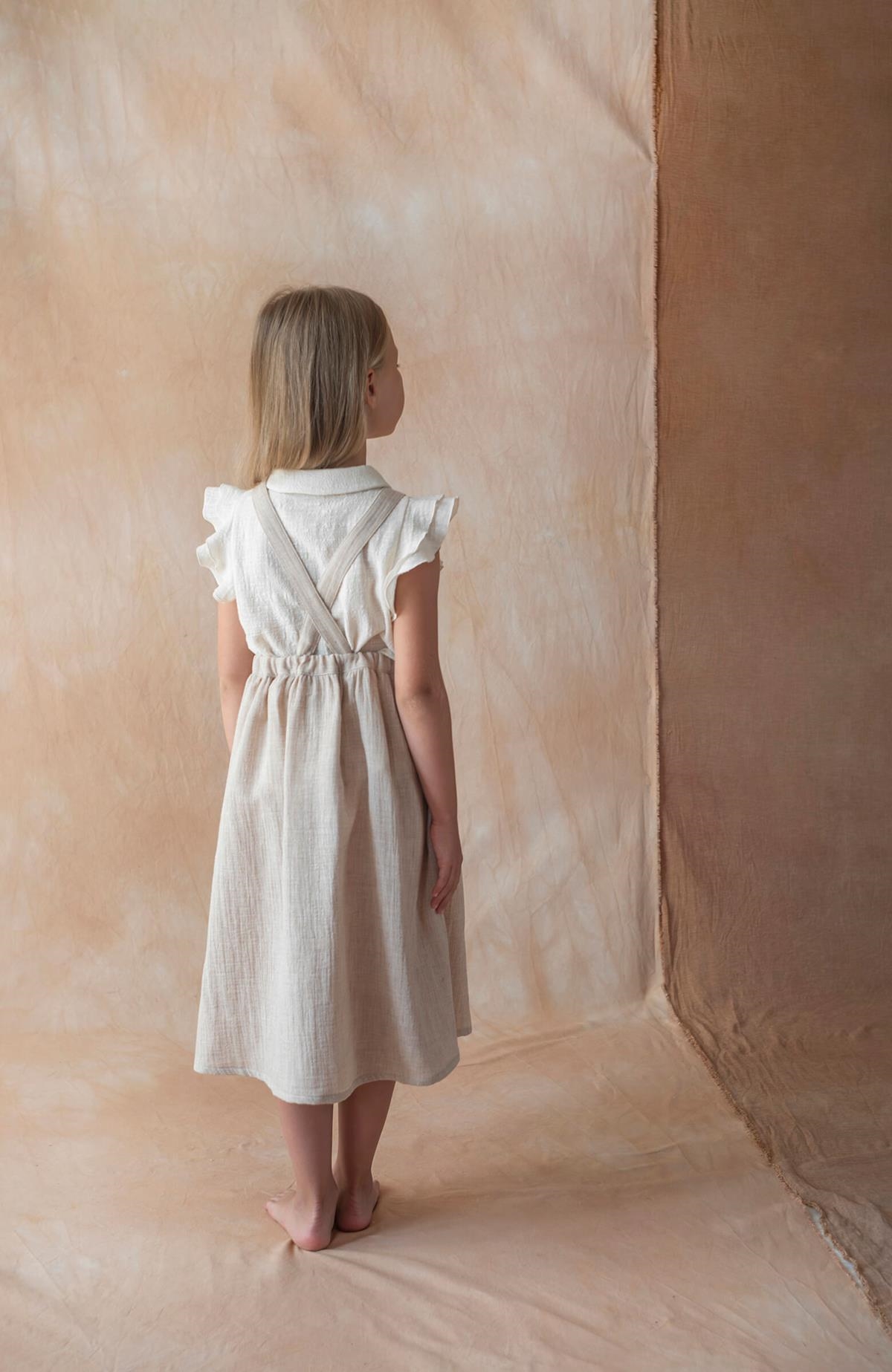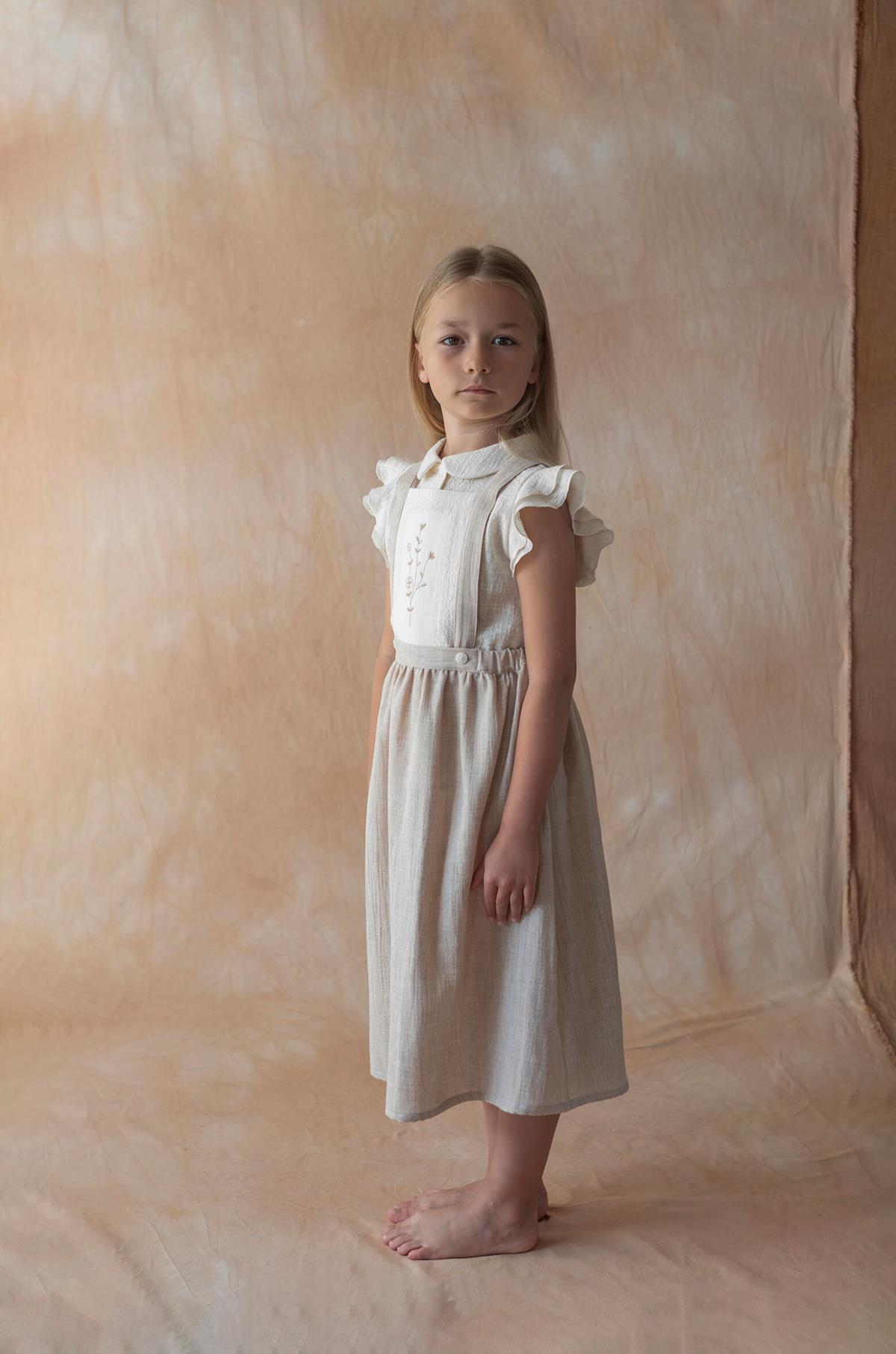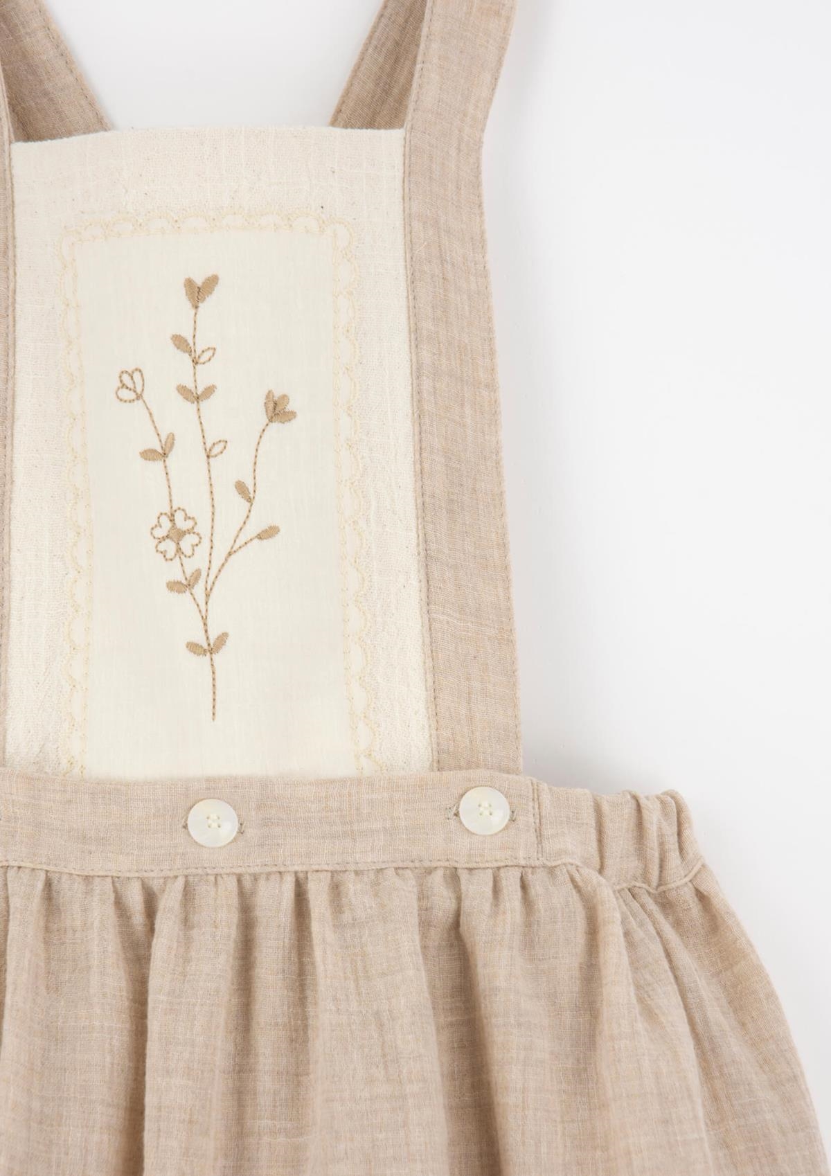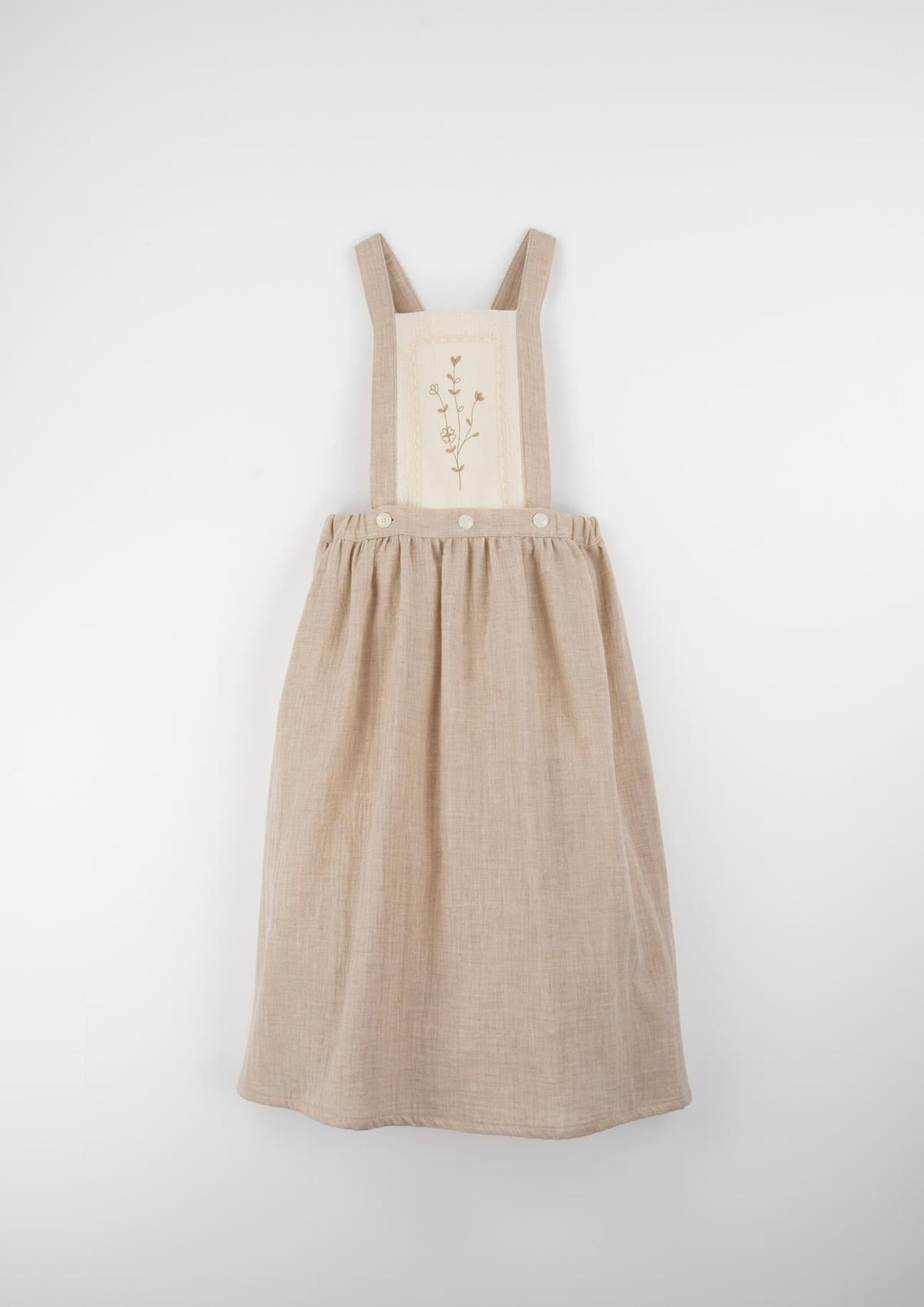 Midi skirt with straps and embroidered bib. Elasticated waist and straps crossing over at the back with button on the front.