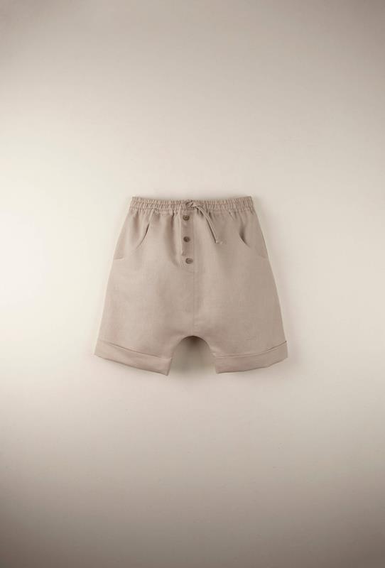 Bermuda shorts with false fly detail and wood buttons. Turn-up bottom. Elasticated waist with adjustable drawstring. Side pockets and patch pocket on back.