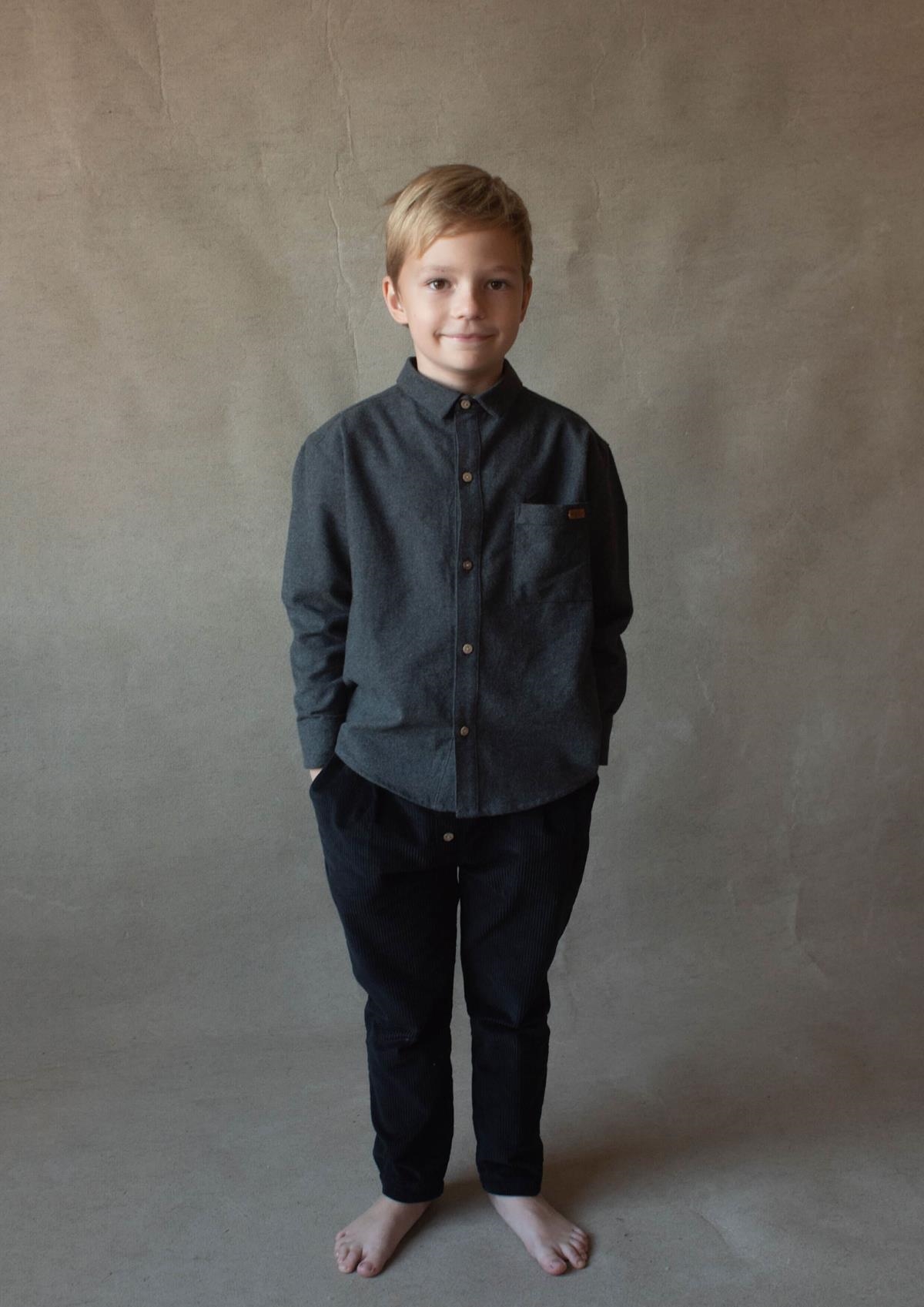 Corduroy chino trousers with side pockets and front pleats. Button-hole elasticated adjustable waist. Decorative placket with wooden buttons on the front.