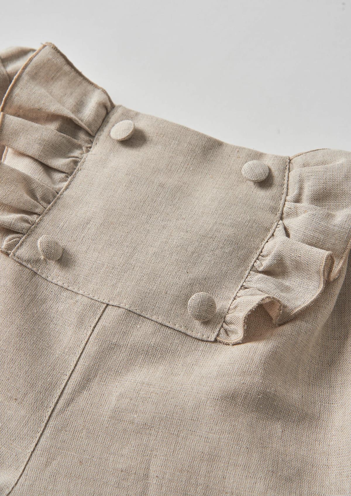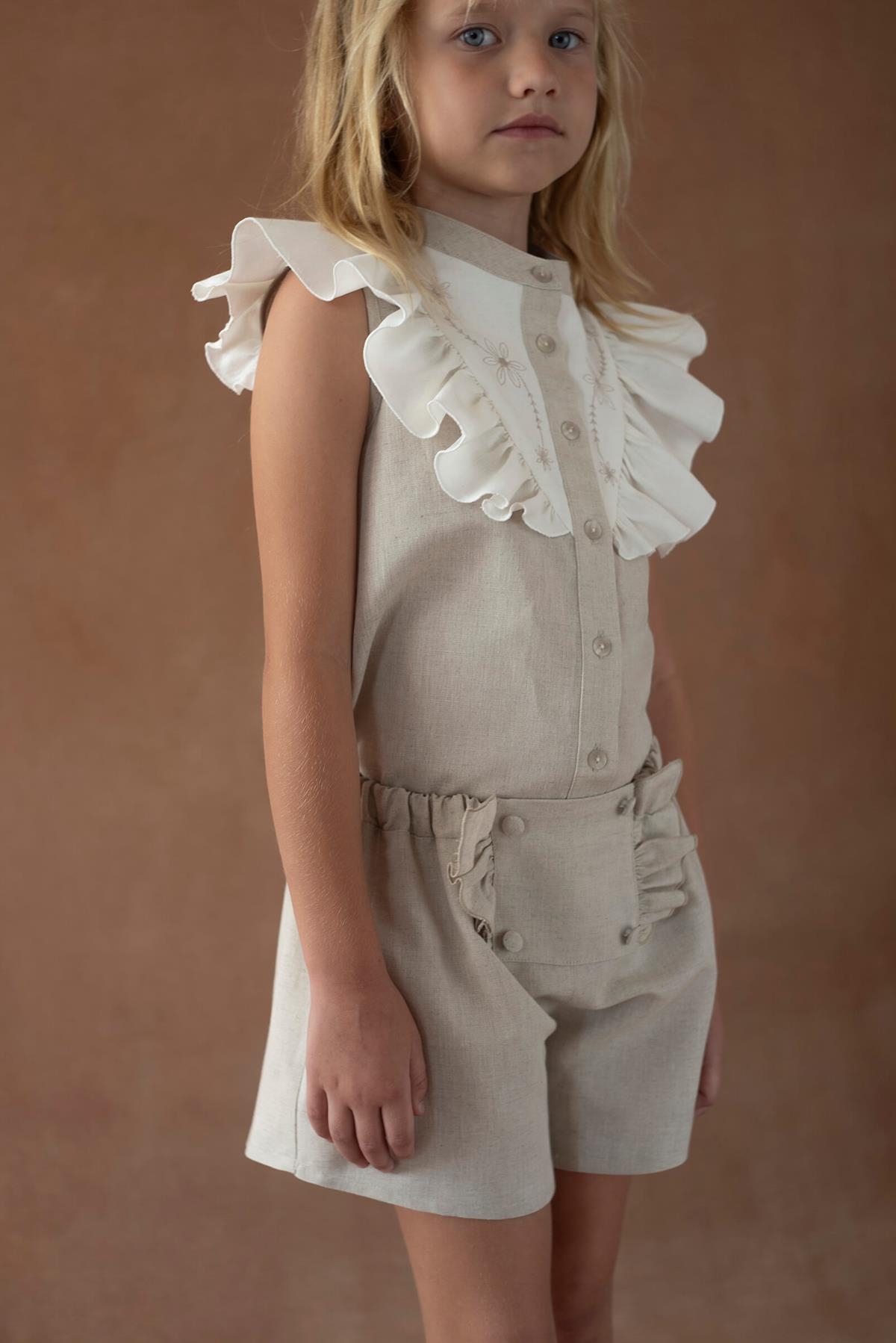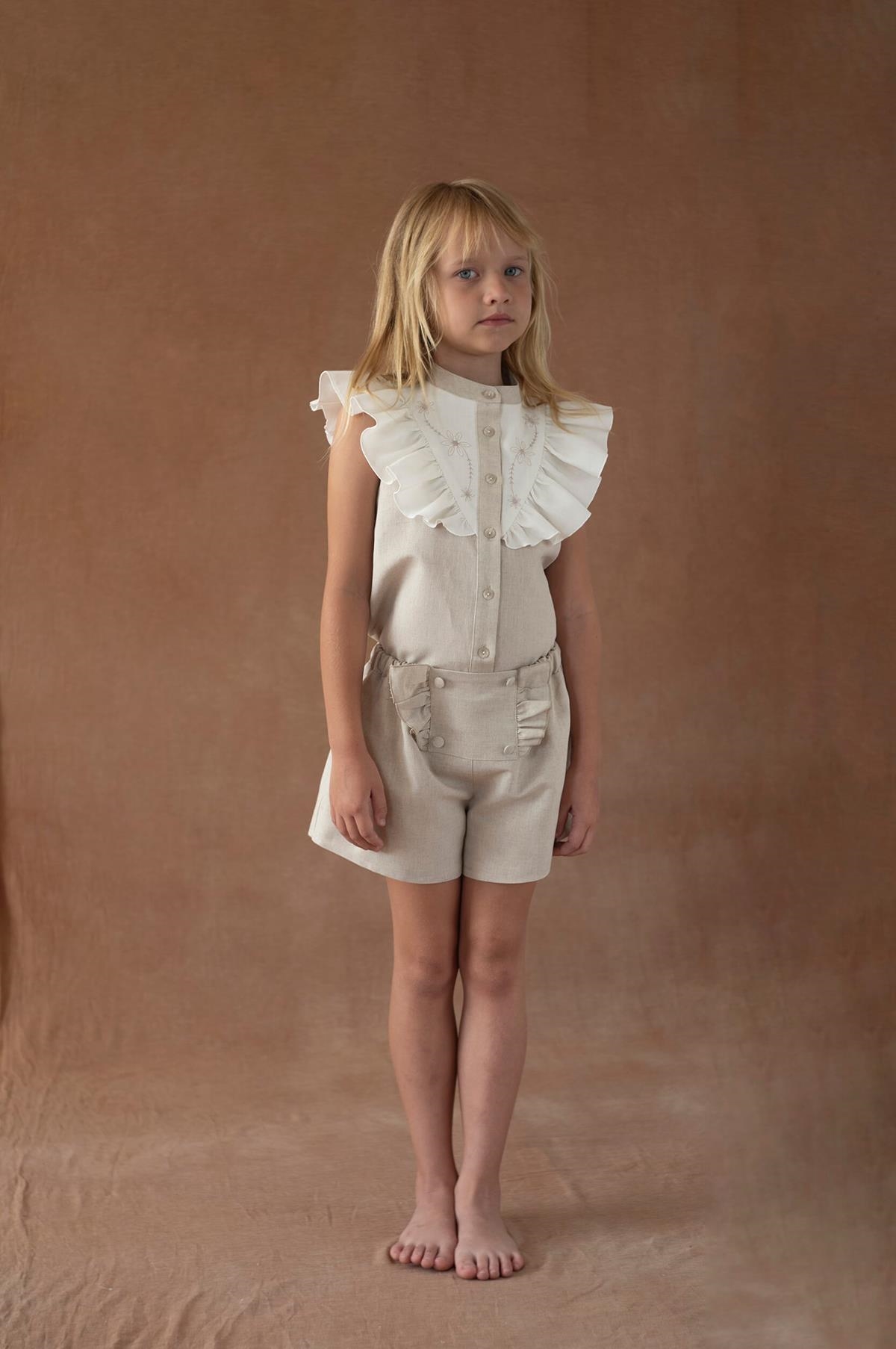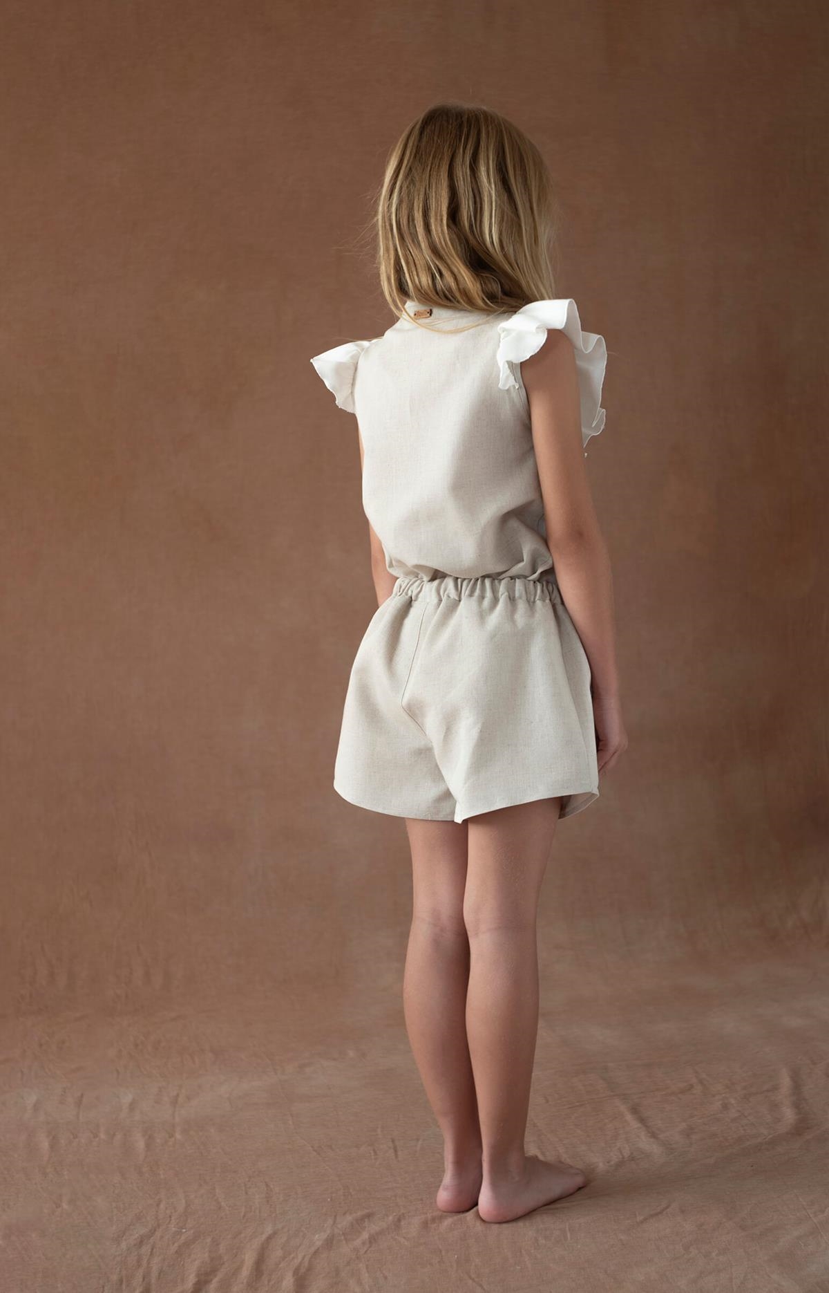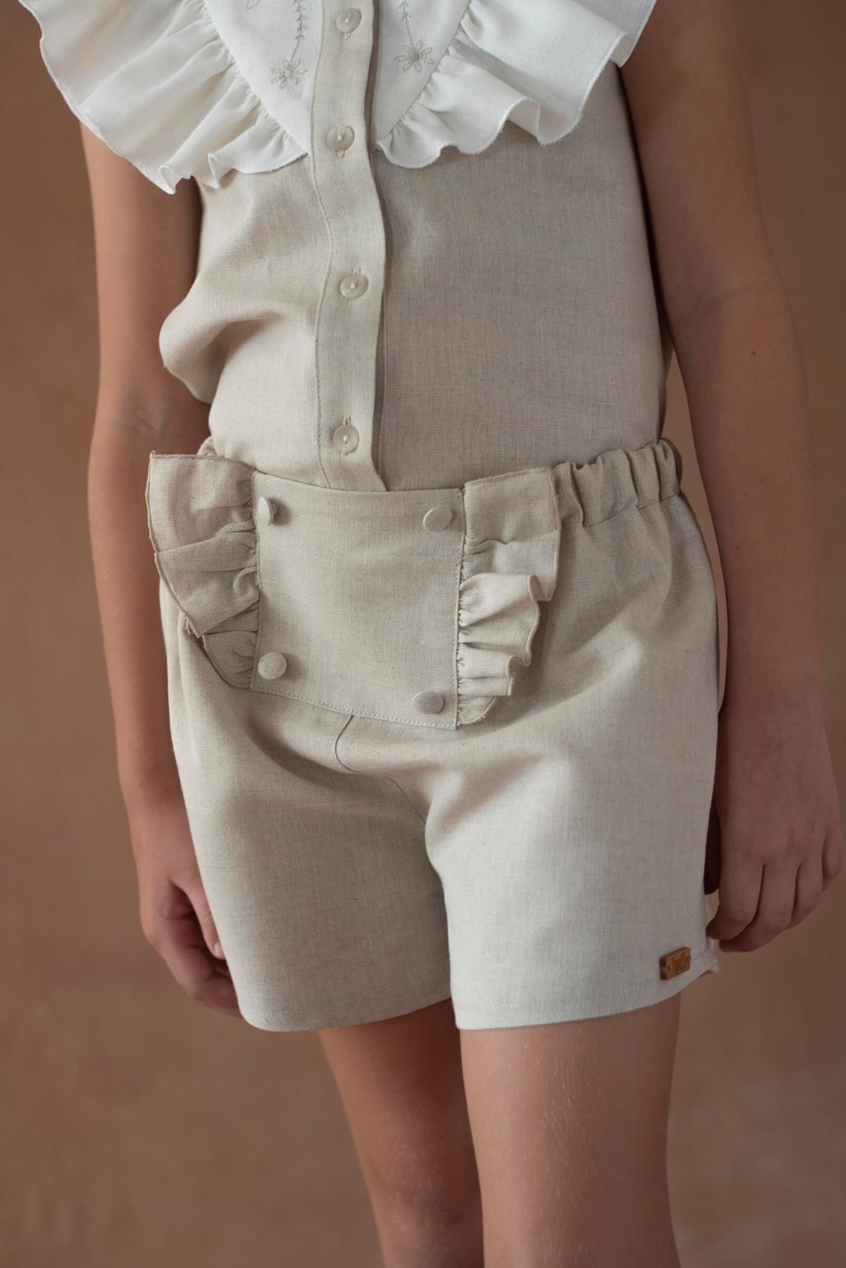 Shorts with decorative central segment, frills and fabric buttons. Elasticated waist. 100% organic cotton lining.