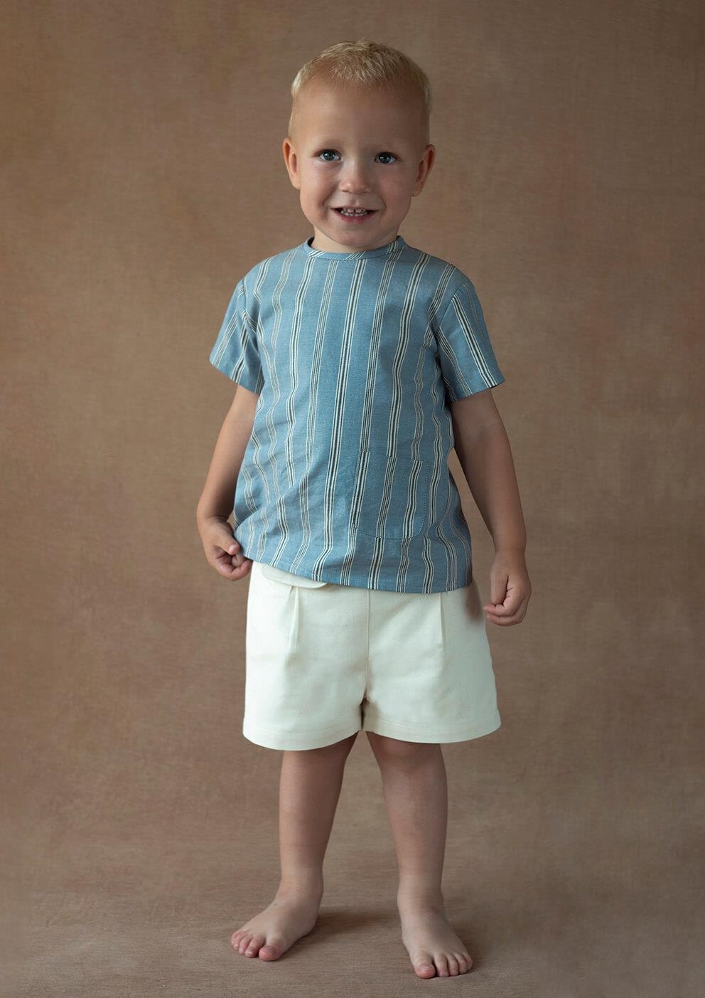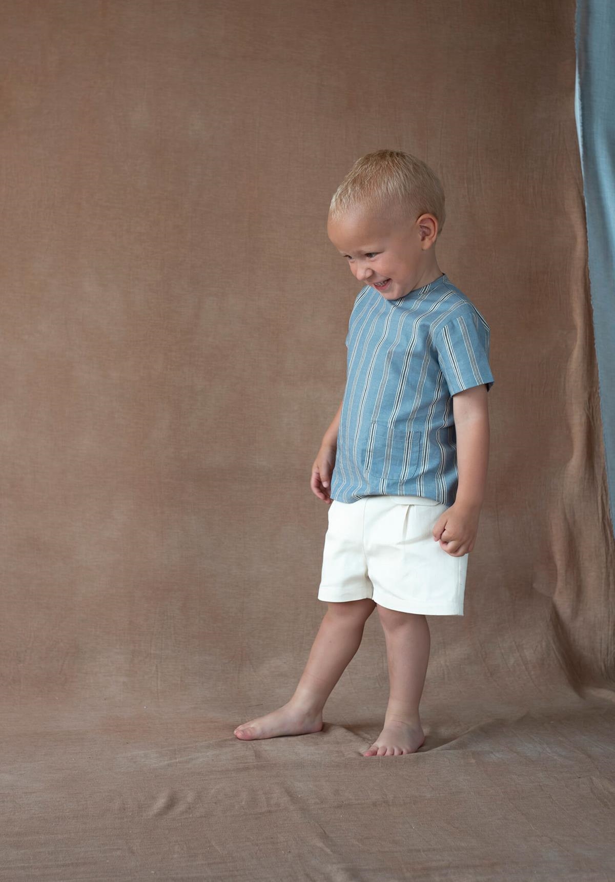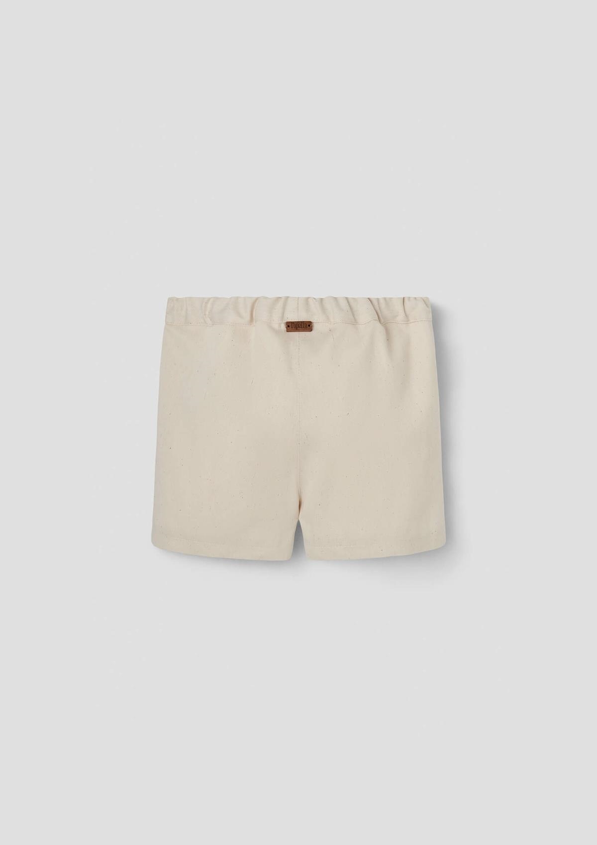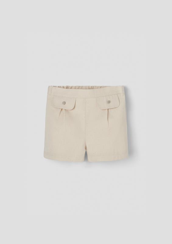 Shorts with decorative flaps and button on the front. Elasticated waist with buttonholes. 100% organic cotton lining.