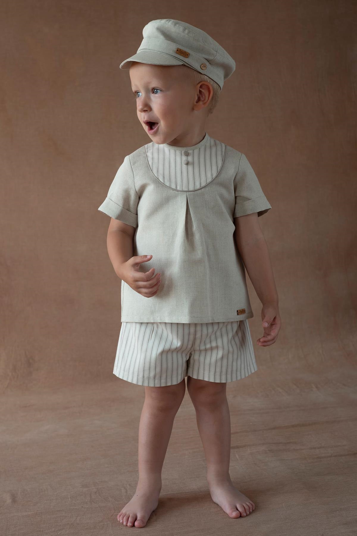 Shorts with decorative flaps and button on the front. Elasticated waist with buttonholes. 100% organic cotton lining.